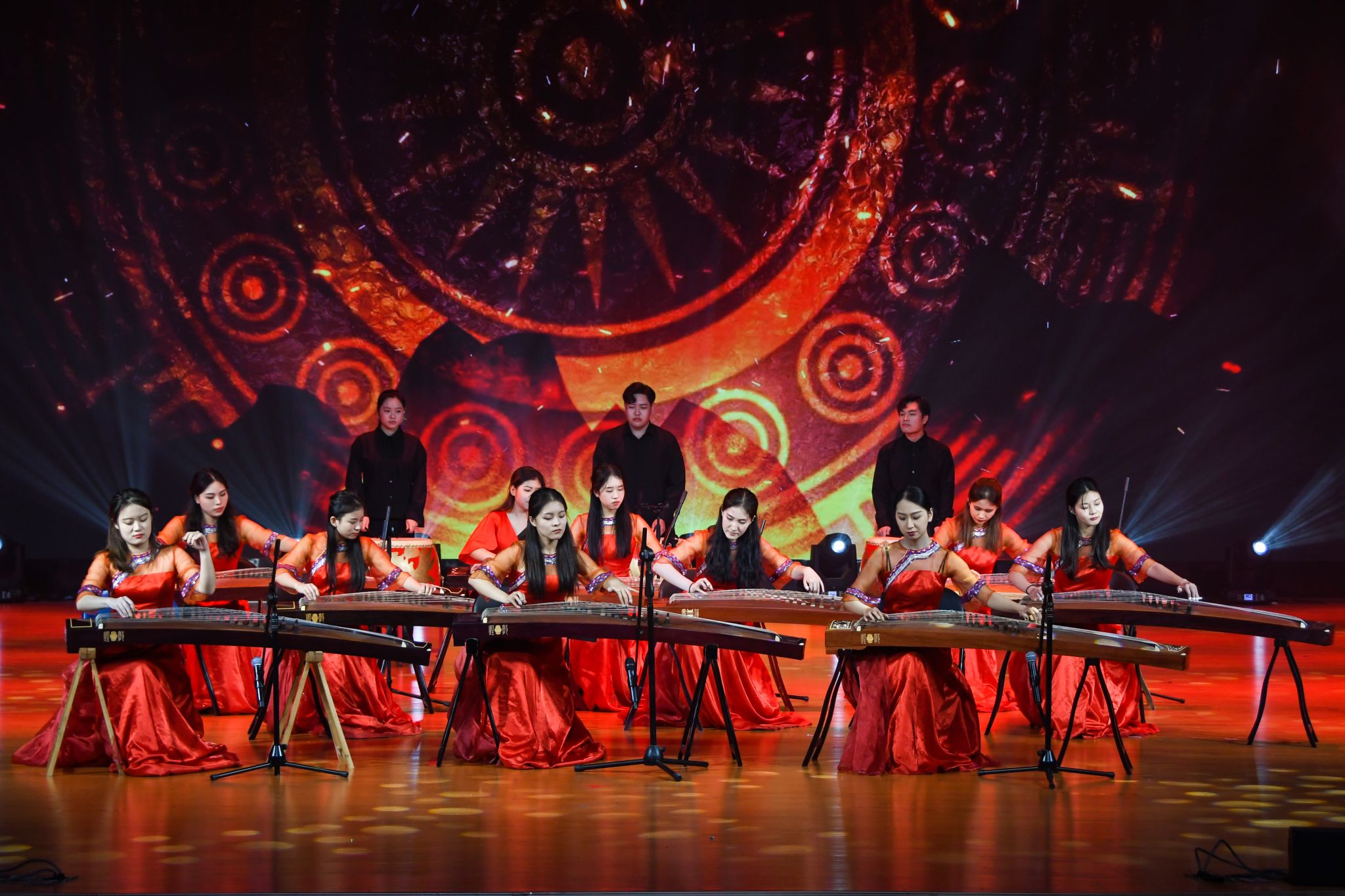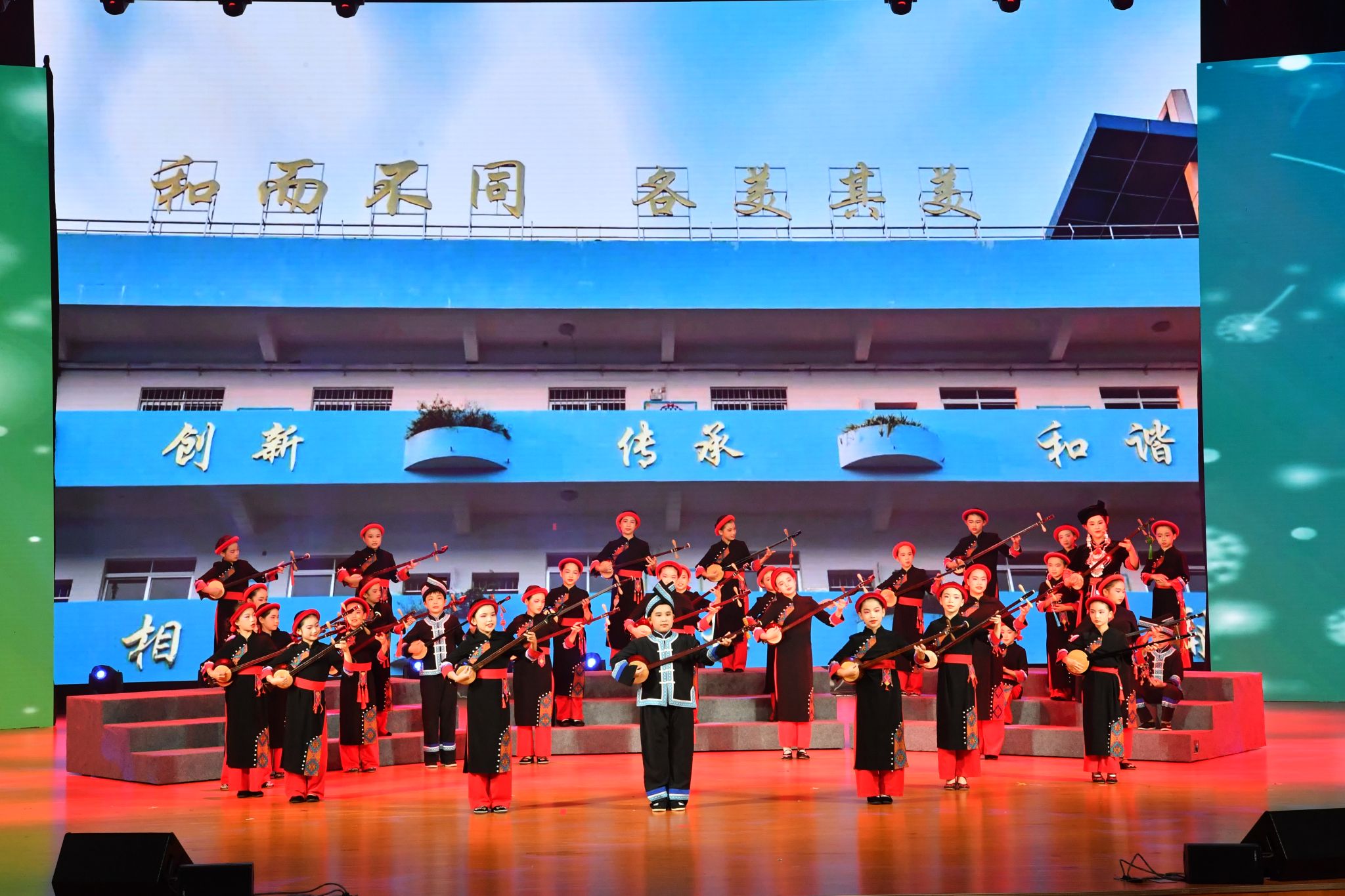 实干兴邦,踔厉奋斗。第二乐章“我们的奋斗”彰显新时代民大人笃行不怠、奋发向上的精神。器乐演奏《骆越情》极富层次感和表现力,古筝悠扬的音色勾勒出壮族先祖刀耕火种、繁衍生息的画面。小品《蓝焰小队》以生动幽默的表演风格向观众敲响校园消防安全的警钟。舞蹈《水娘钗》表演者舞姿婀娜轻盈,极具民族特色。歌曲《海耕谣》用变奏的手法将歌谣主题交替展现,层层推进,歌颂京族儿女坚韧不拔、自强不息的精神品质。我校驻东兰村第一书记和工作队队员代表带来的合唱《早安,阳光》,在振奋人心的和声中唱出扎根基层工作者的坚守与无私奉献,唱出新时代新征程上百姓生活的希望与期待。