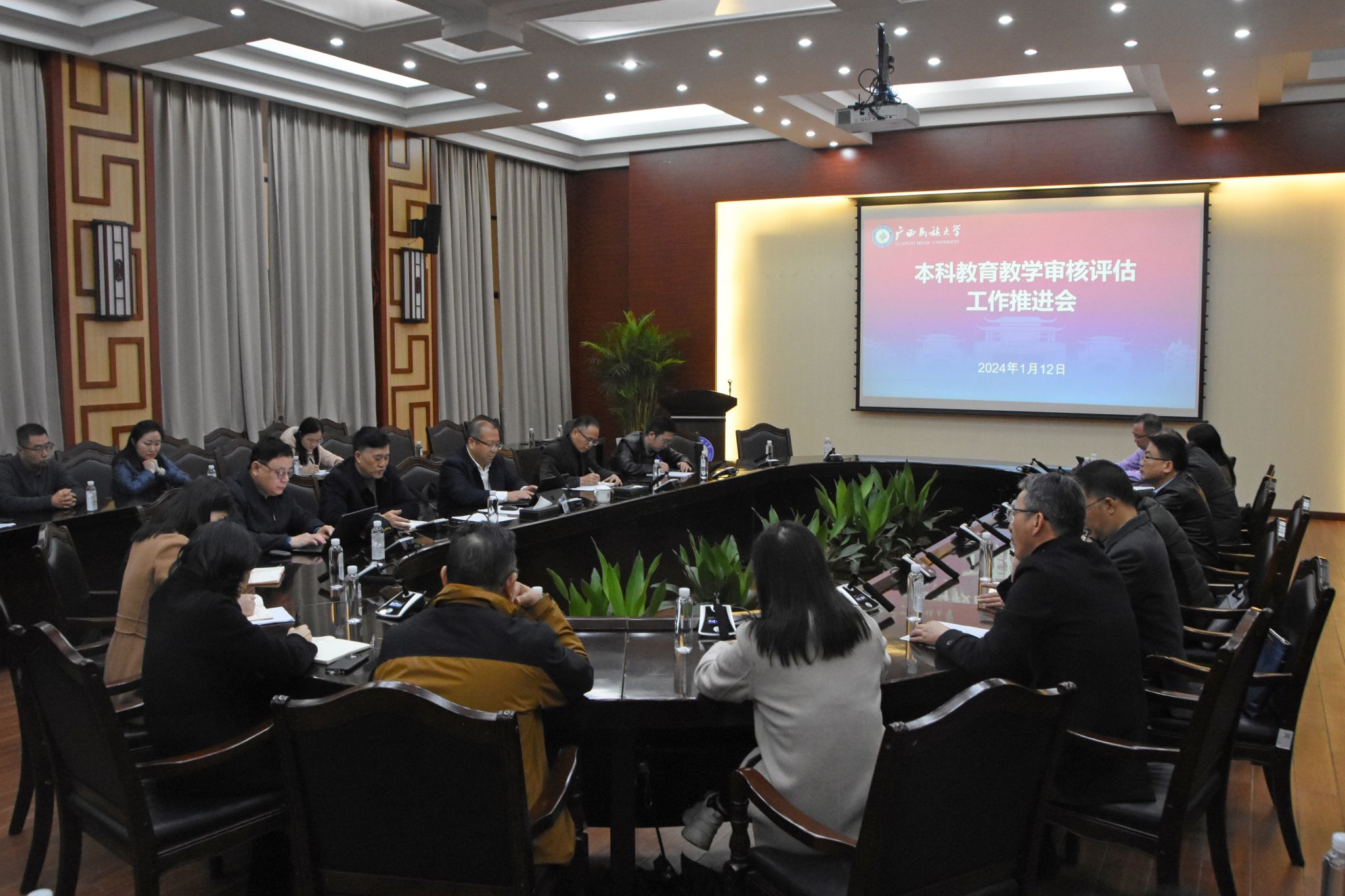 【大学生通讯社报道】1月8日至12日,我校分别在武鸣校区、思源湖校区、相思湖校区召开本科教育教学审核评估工作推进会。党委常委、副校长、评估办主任姜明国出席会议。教务处处长、评估办副主任王新哲,各本科学院党委书记、院长、分管教学副院长、教学秘书,学校督查室领导,以及学校评估办全体人员参会。