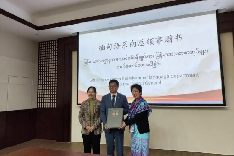 缅语系教师欧江玲、杜瓦底丁向总领事馆赠送缅甸语系各位教师出版的书籍,表达了对总领事一行的欢迎与敬意。同时,觉梭登代表总领事馆向学校和缅甸语系赠送缅甸语书籍、学习资料、缅甸文化工艺品和缅甸旅游资料光碟,并表达对我校缅甸语系进一步发展的期待。