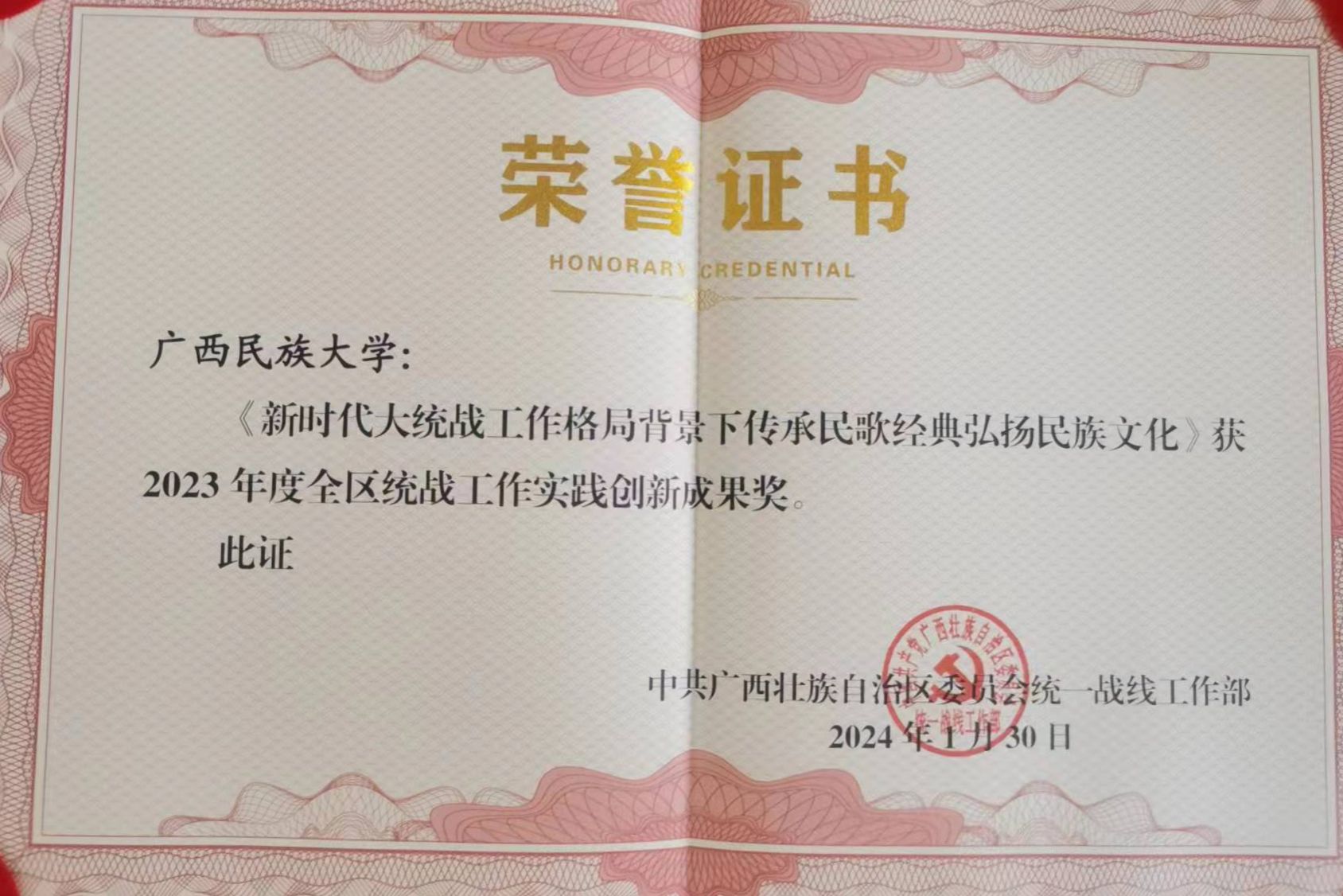 澳门网投官方网站《新时代大统战工作格局背景下传承民歌经典弘扬民族文化》项目获2023年度全区统战工作实践创新成果奖