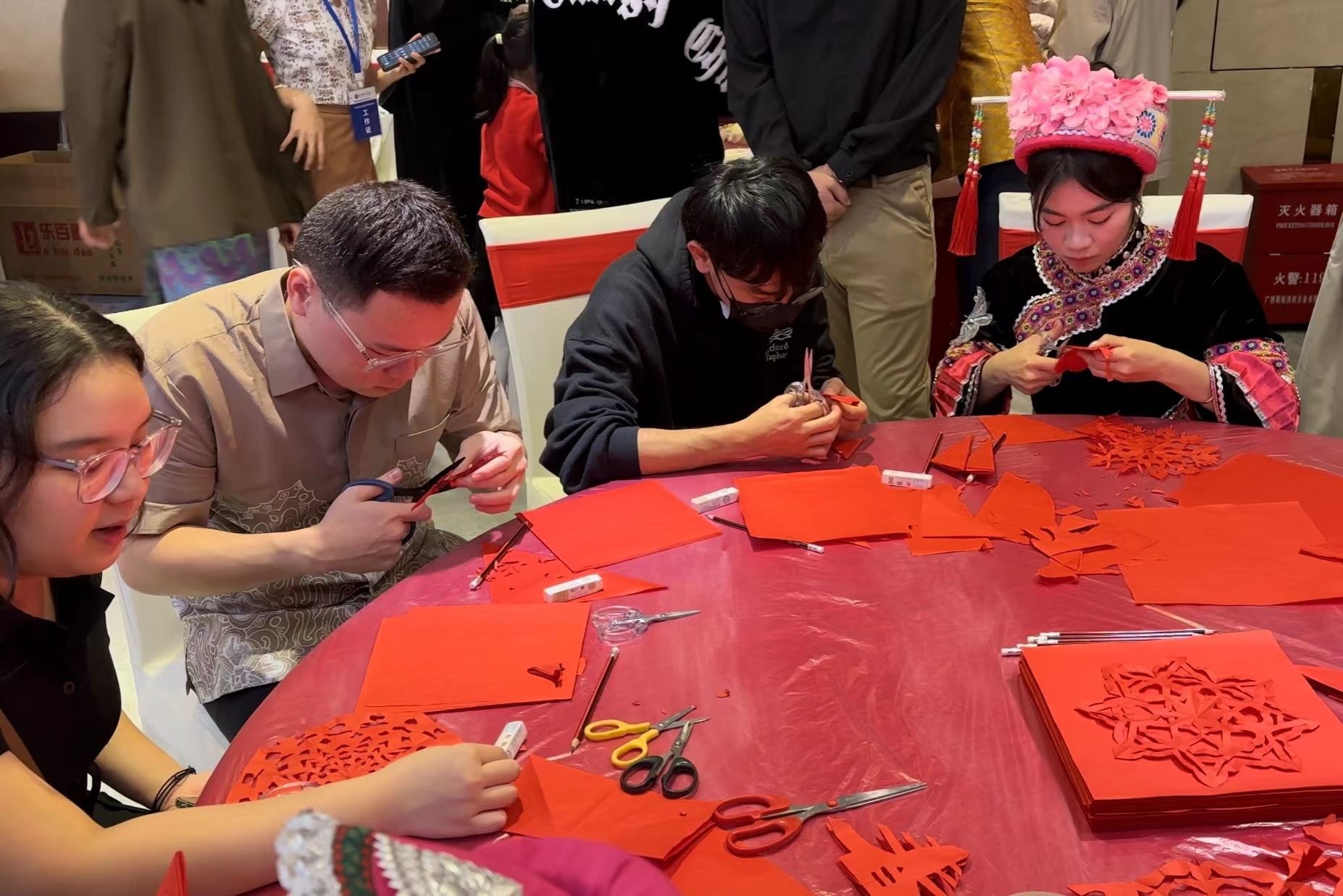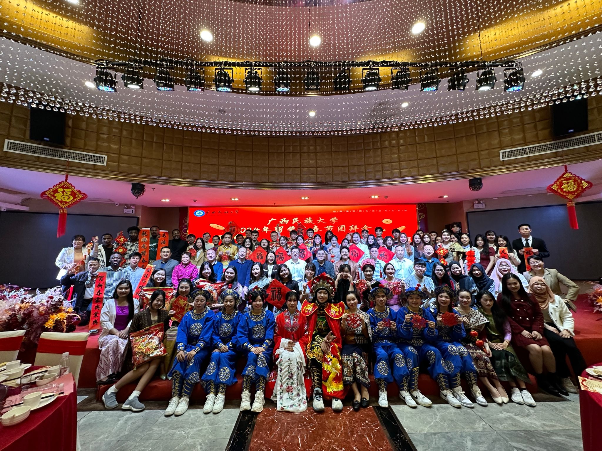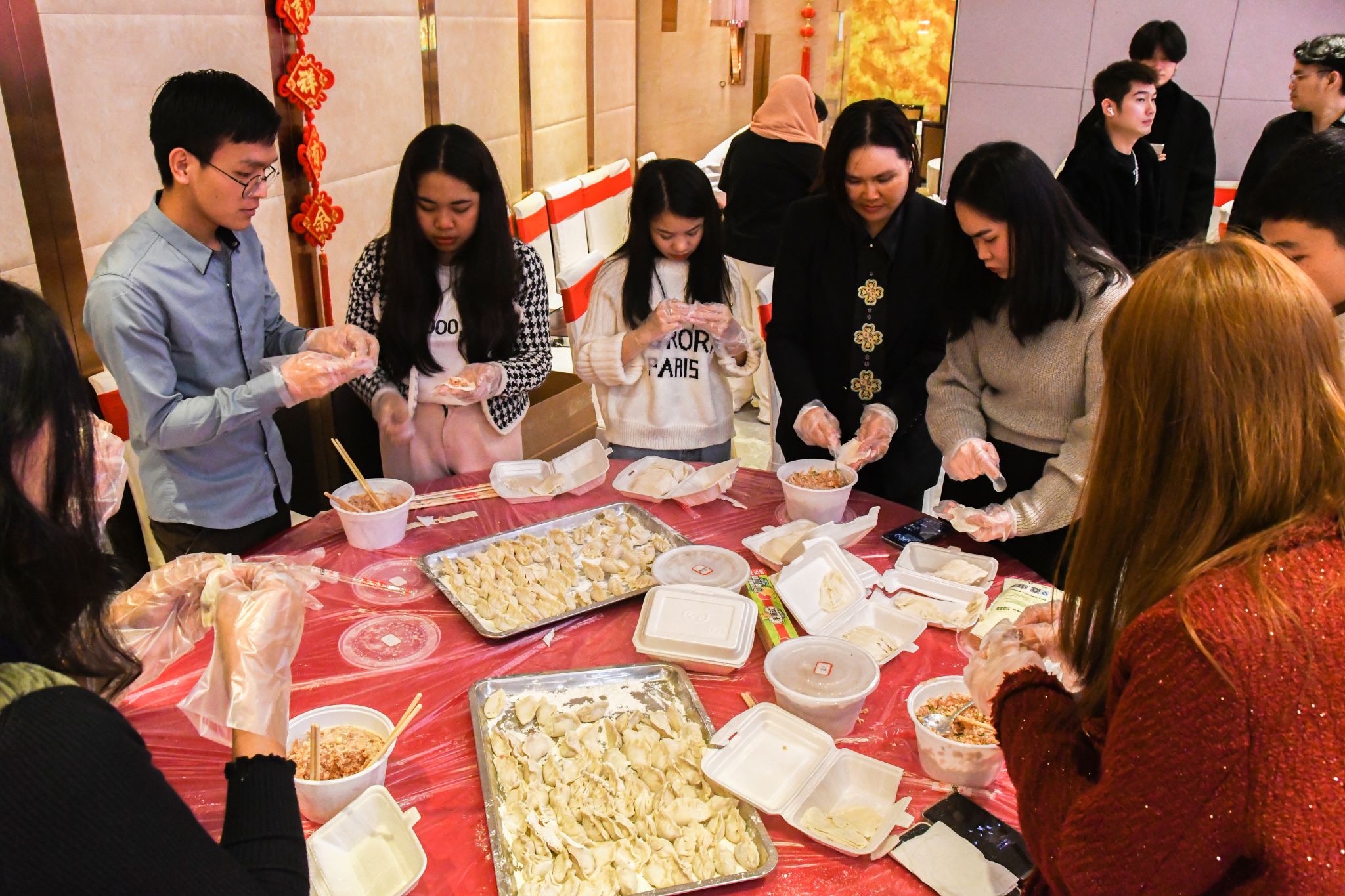 团拜会前,开展中国传统文化体验活动,与会领导、老师与留学生们包饺子,写“福”字、春联,剪窗花,猜字谜;团拜会上,留学生们表演文艺节目,为观众带来了一场视听盛宴。(初审:肖海芹 复审:荣子卿 终审:王文娟)