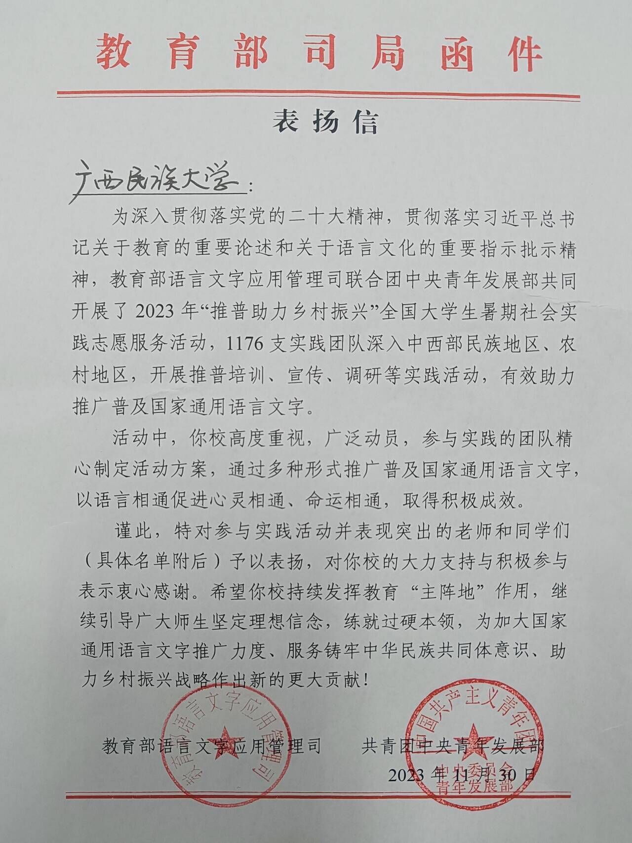 澳门网投官方网站将持续发挥教育“主阵地”作用,号召广大师生向优秀组织与团队学习,继续引导师生坚定理想信念,练就过硬本领,为加大国家通用语言文字推广力度、服务铸牢中华民族共同体意识、助力乡村振兴战略作出新的更大贡献。(初审:肖耀科 编辑:秦浩铭 校对:王馨 朱云芬 韦丽娜 复审:荣子卿 终审:王文娟)