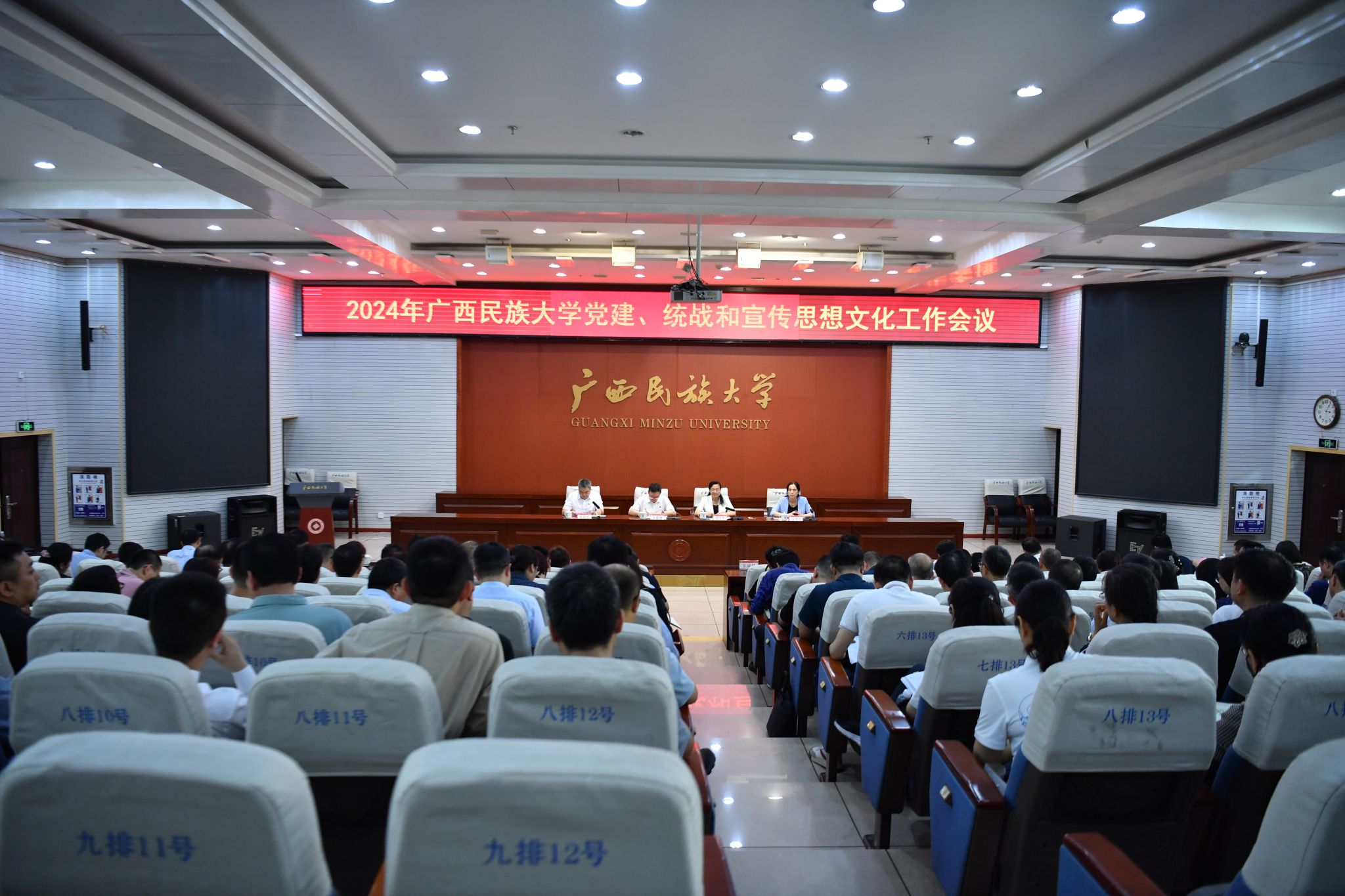 【大学生通讯社报道】4月2日,2024年澳门网投官方网站党建、统战和宣传思想文化工作会议在科技楼报告厅召开,校党委书记卞成林,党委副书记、校长韦仕珍,校领导陈铭彬、韦雪芳、蔡高根、黄晓娟、何立荣出席会议。学校全体中层领导干部与会。