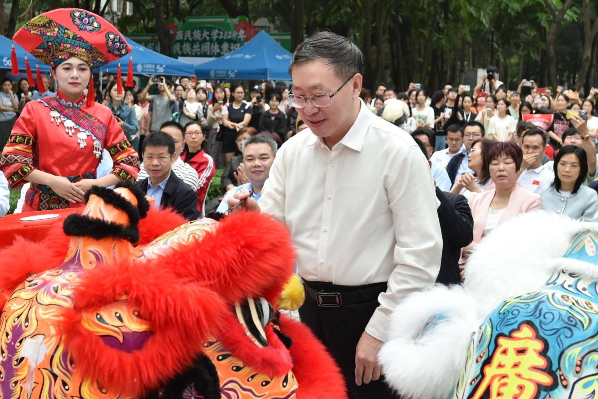 澳门网投官方网站党委书记卞成林,校长韦仕珍为迎宾双狮点睛,活动正式拉开帷幕。鼓点铿锵有力,两头狮子时而嬉戏打闹,时而摇头摆尾,时而翘首仰视,动作俏皮可爱。随着鼓声大震,狮口中的对联顺势展开——各族师生一家亲,民族团结我同行,现场迅速升温。
