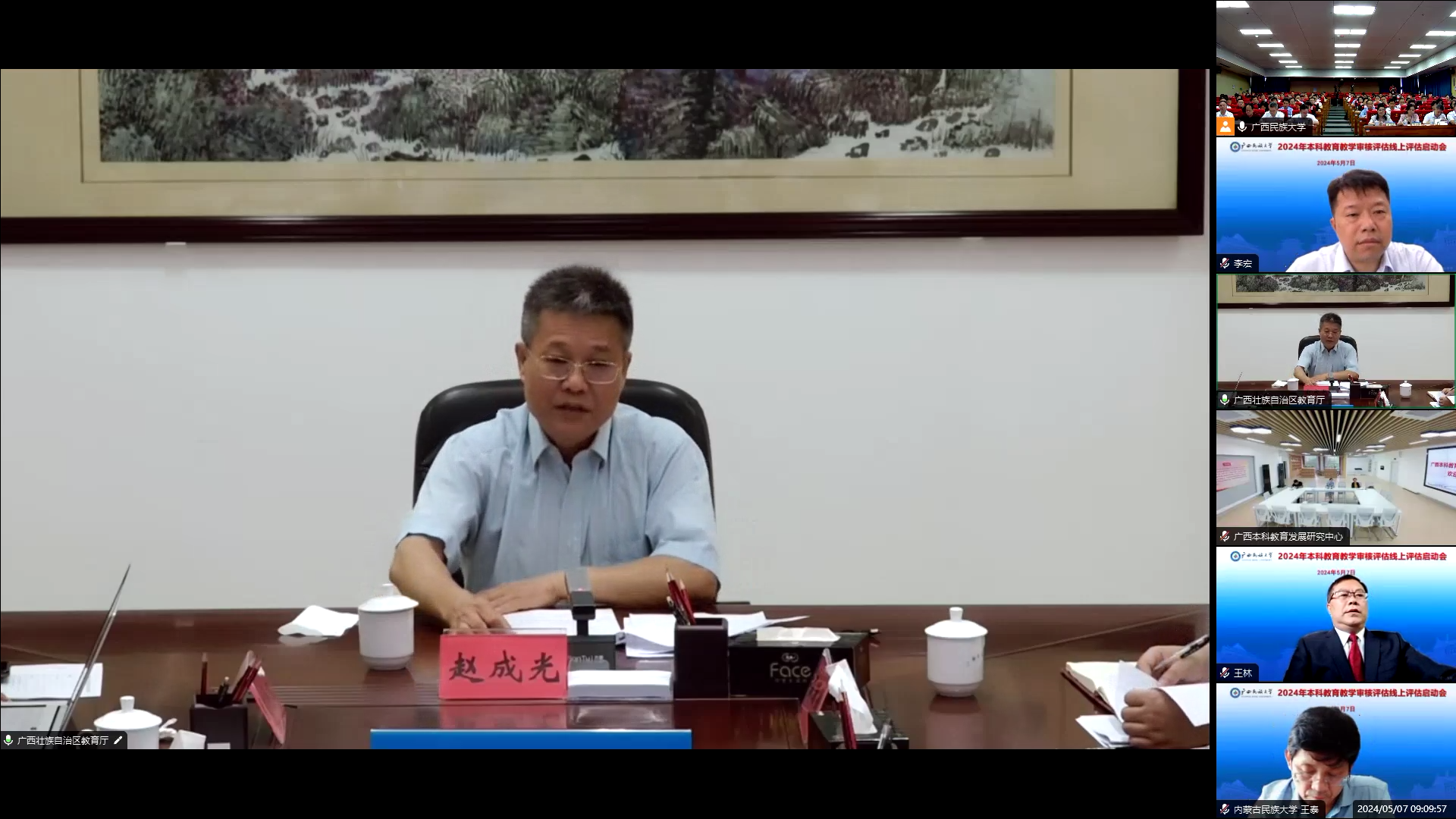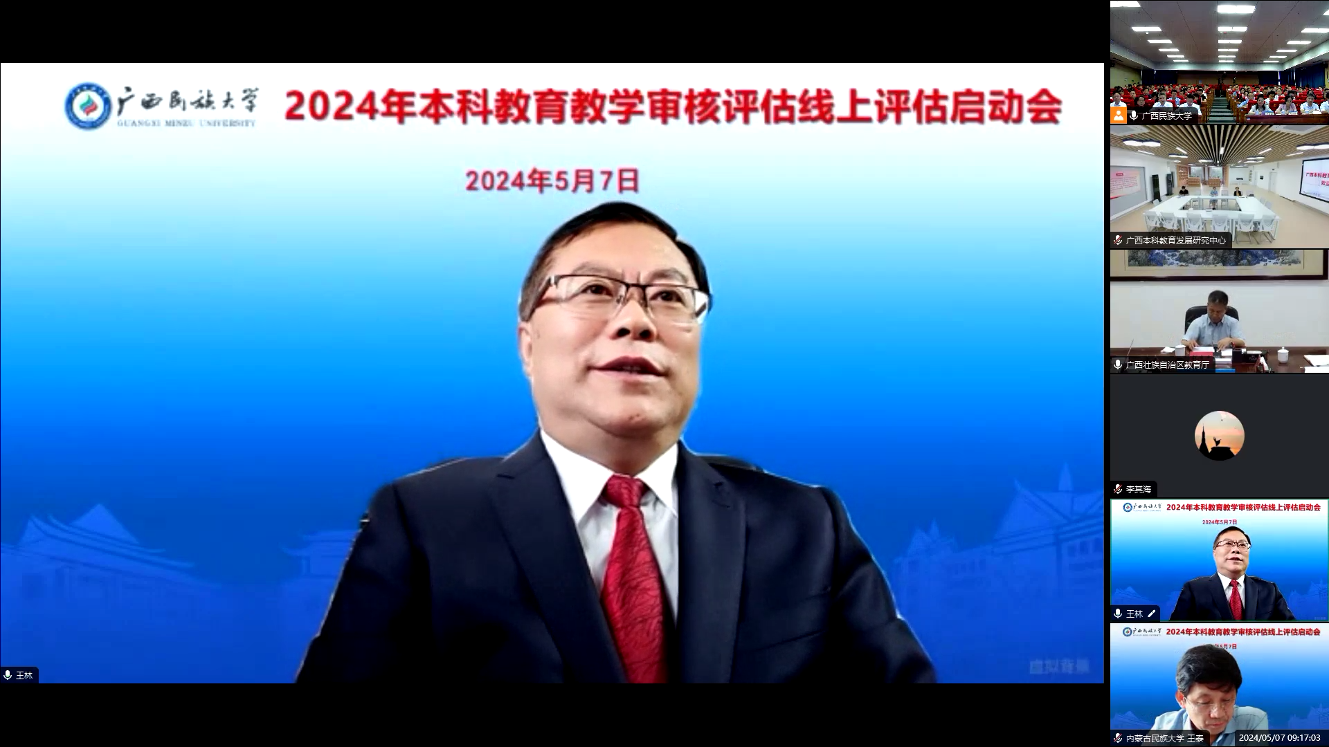 【大学生通讯社报道】5月7日上午,澳门网投官方网站本科教育教学审核评估线上评估启动会在相思湖校区图书馆13楼报告厅召开,审核评估专家组组长、贵州民族大学校长王林,澳门网投官方网站党委书记卞成林,校长韦仕珍,自治区教育厅二级巡视员赵成光,广西本科教育发展研究中心副主任、南宁师范大学副校长龙妮娜出席会议。会议由副校长姜明国主持。