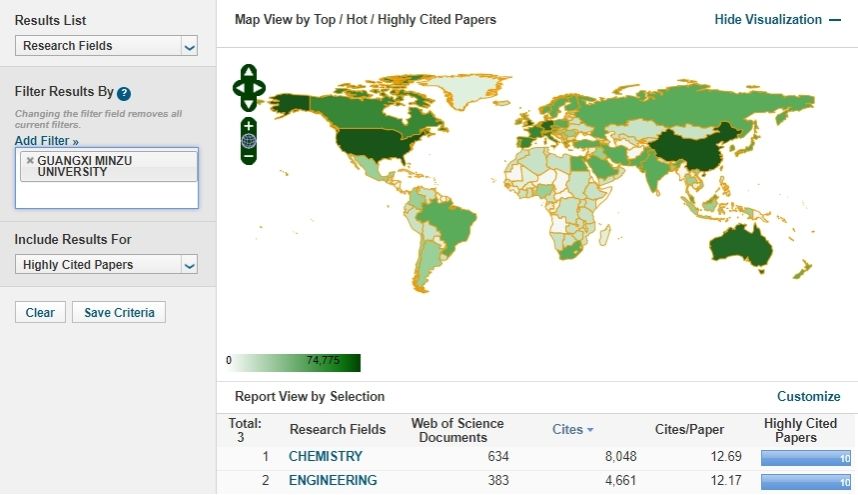 本期数据显示,化学学科共1905所机构入围ESI全球排名前1%,我校化学学科排名1868位,共发表论文634篇,总被引频次8048次,篇均被引12.69次,高被引论文10篇。