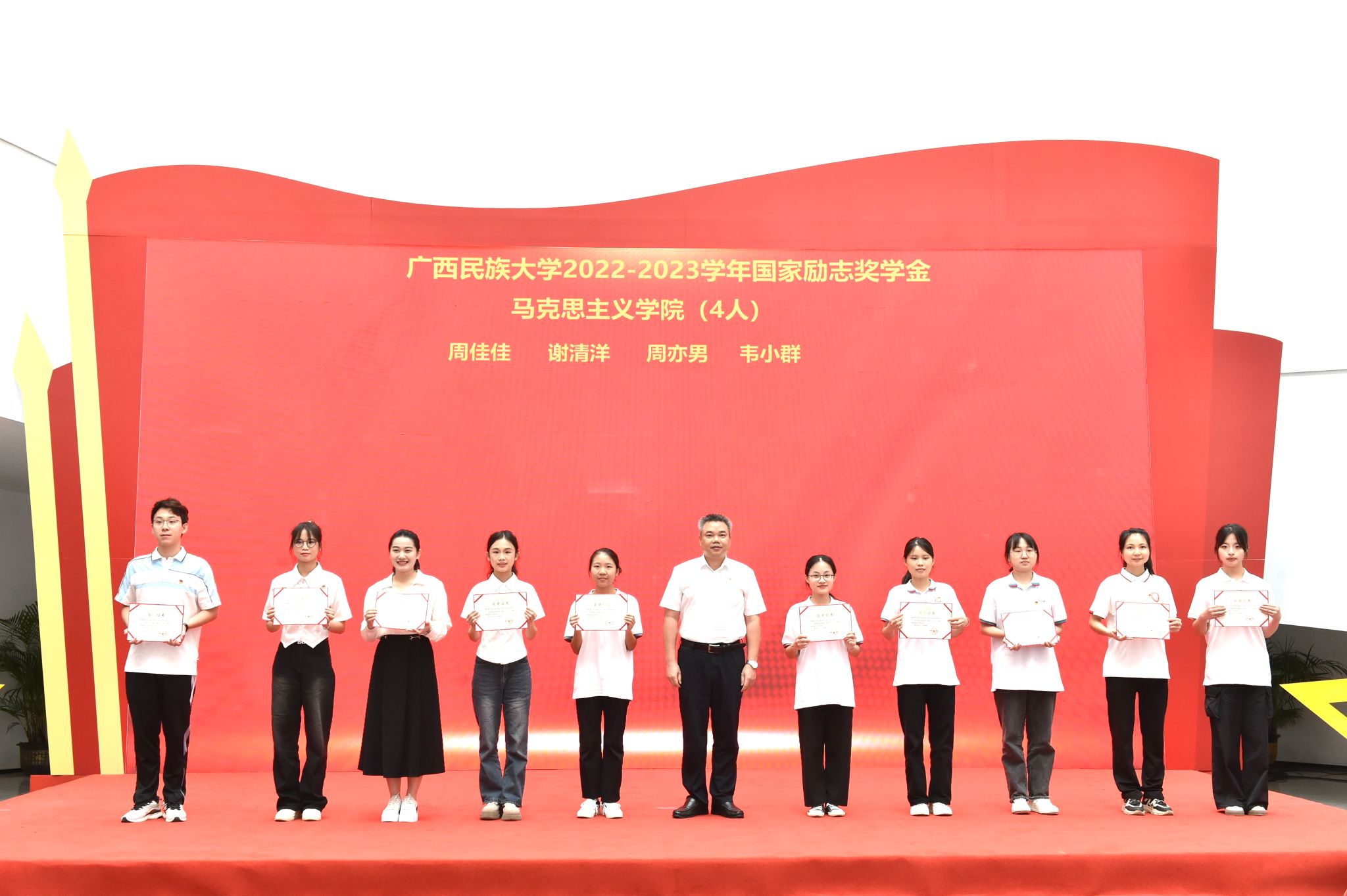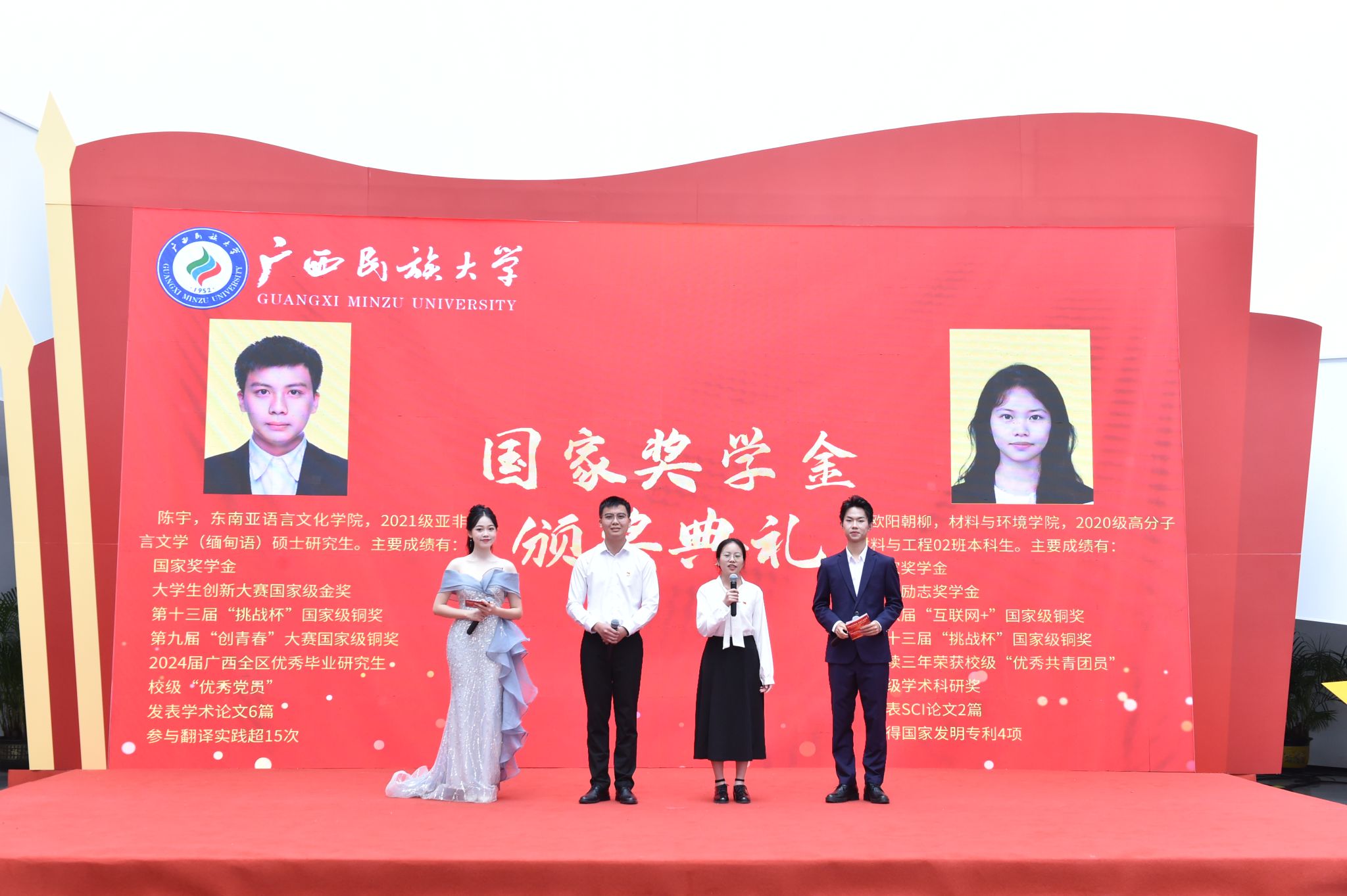 国家奖学金获得者本科生代表欧阳朝柳、研究生代表陈宇分别分享获奖感言。欧阳朝柳表示,作为一名中共党员,祖国的需要就是她的研究方向,今后会将个人前途命运融入国家发展大局,将个人理想融入党和国家的事业中,为中华民族伟大复兴贡献力量。陈宇表示,天道酬勤,青年当应接续奋斗,走好当下之路。希望学弟学妹们能够找准人生方向,努力适应各种环境,为实现人生梦想不断奋斗。