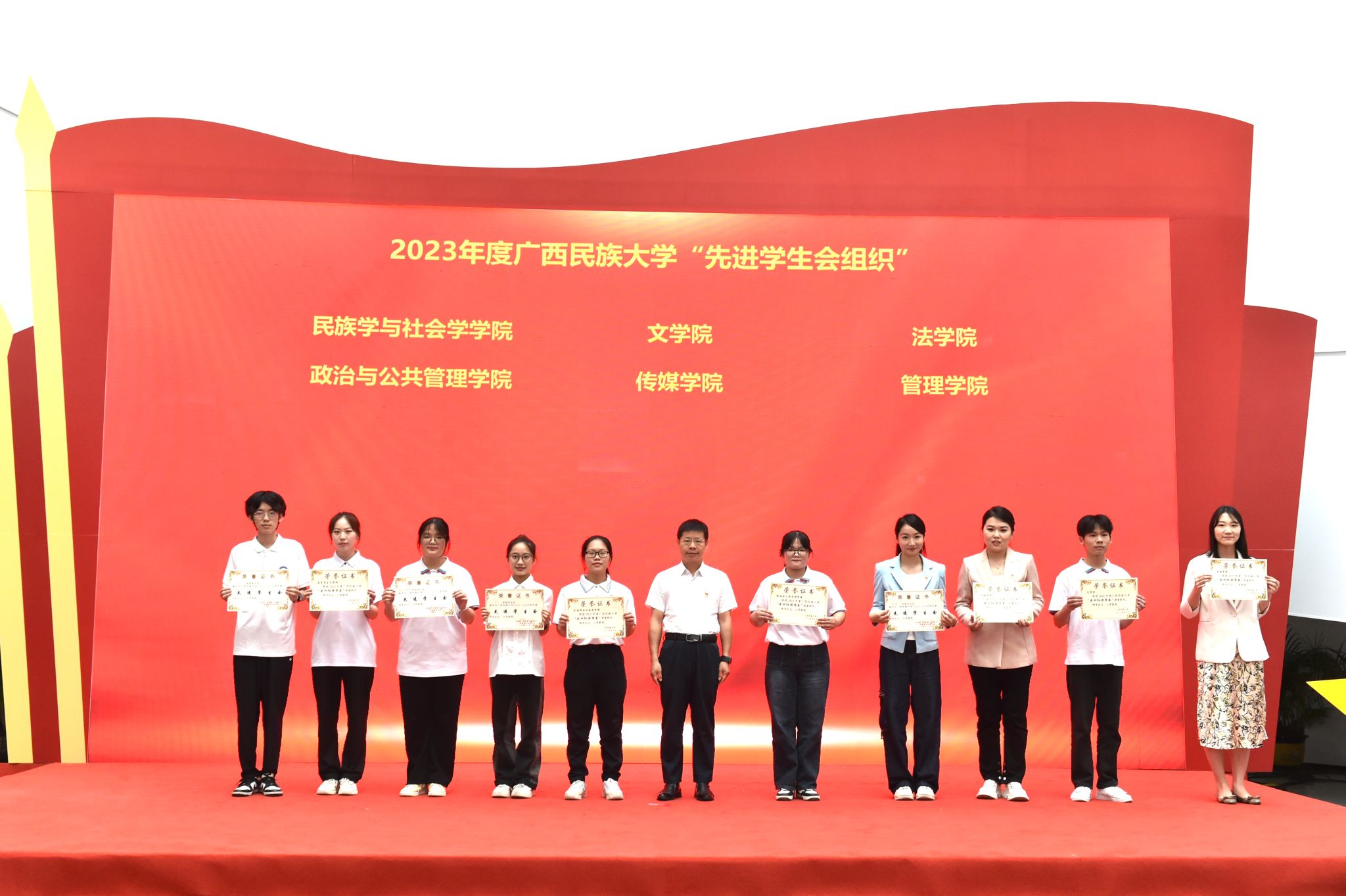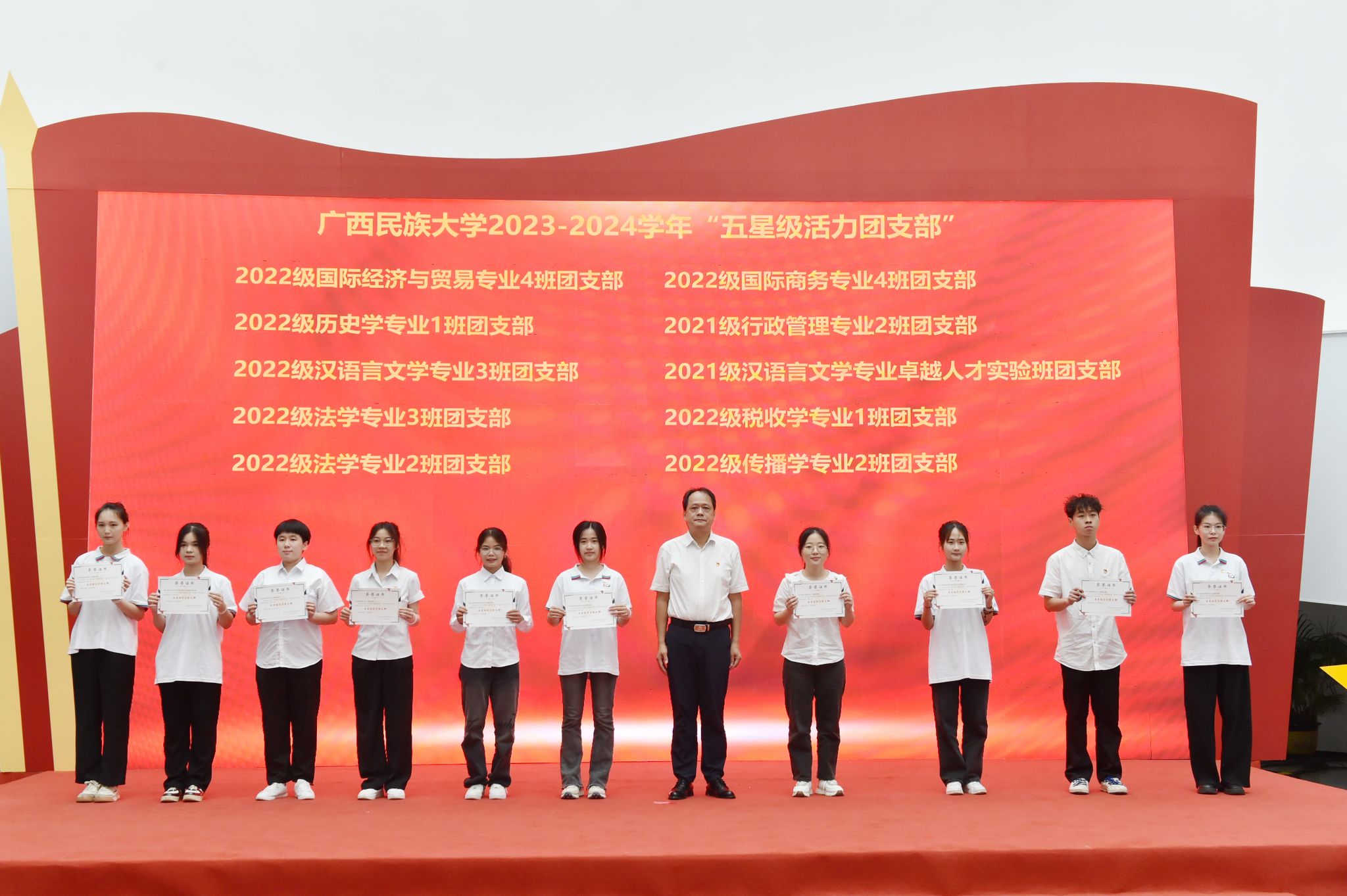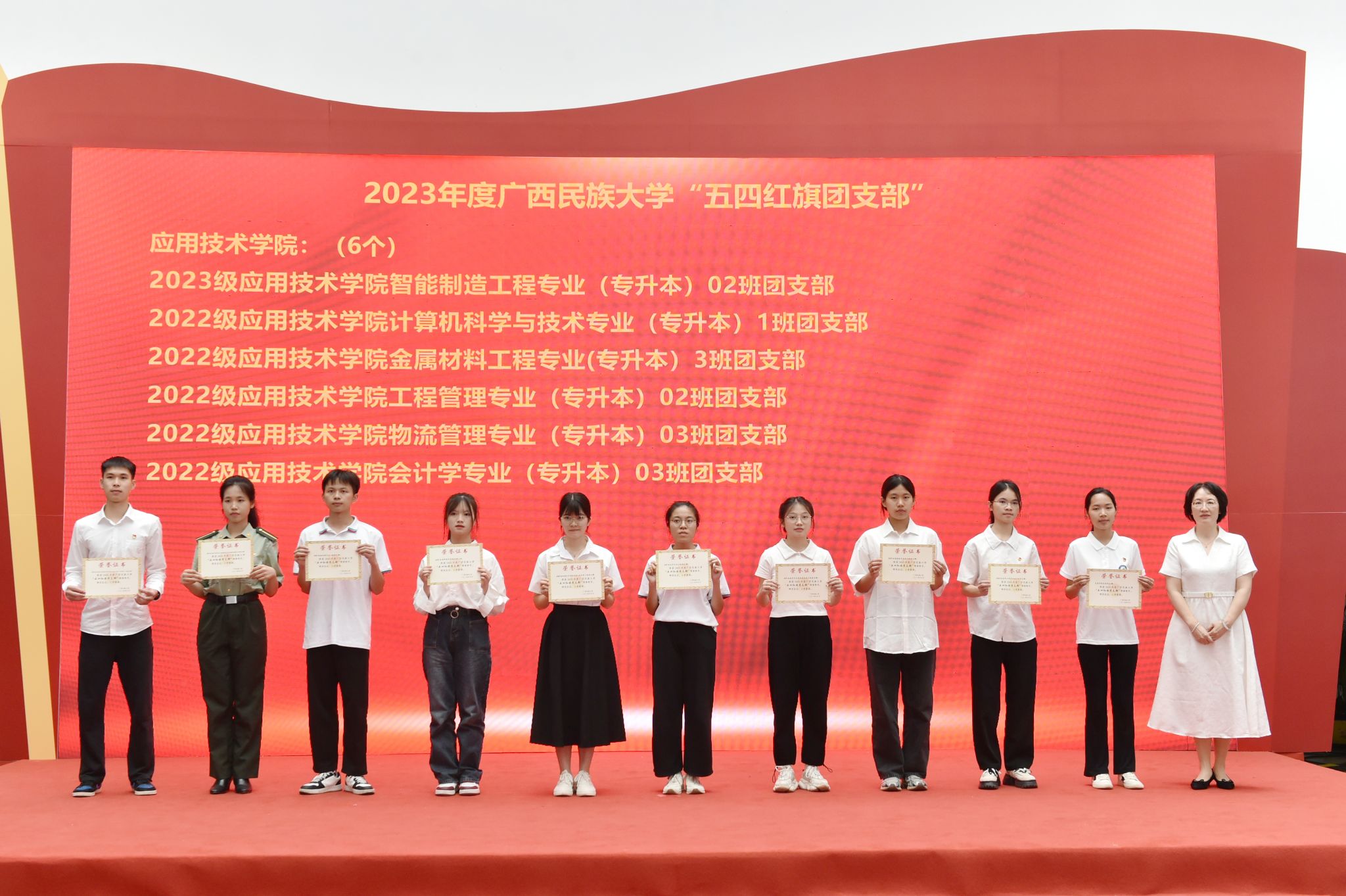 典礼上,学校领导先后为三好学生代表、优秀学生干部代表、优秀共青团员代表、优秀共青团干代表、五四红旗团支部代表、先进班集体代表与优良学风班代表、五星级活力团支部代表、五四红旗团委及先进学生会组织代表、自治区人民政府奖学金代表、国家励志奖学金代表、国家奖学金代表颁奖。