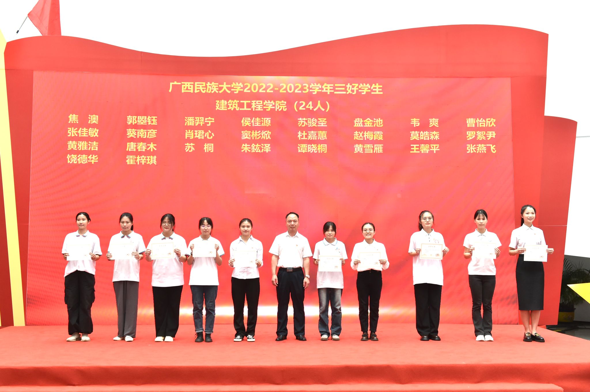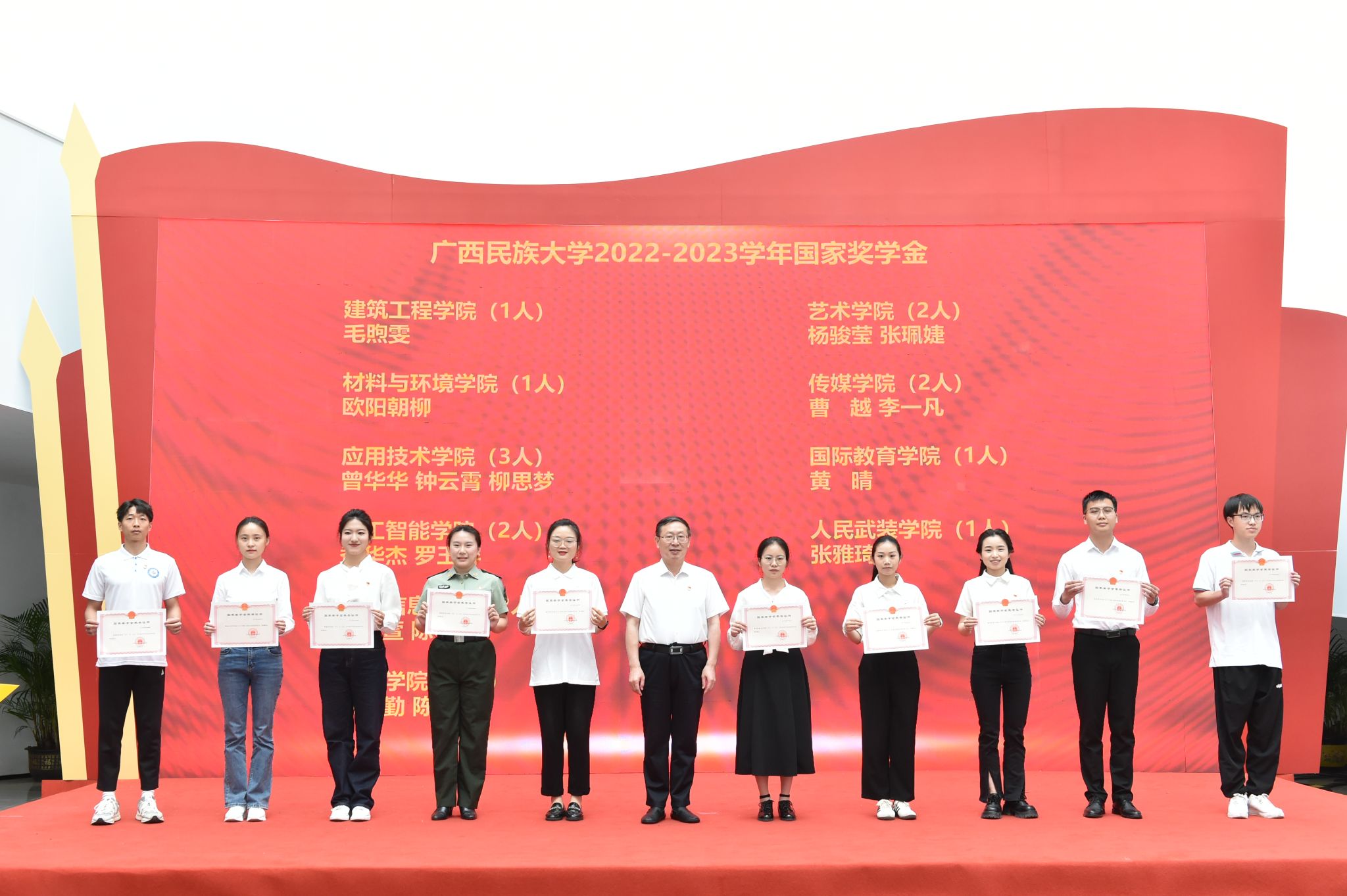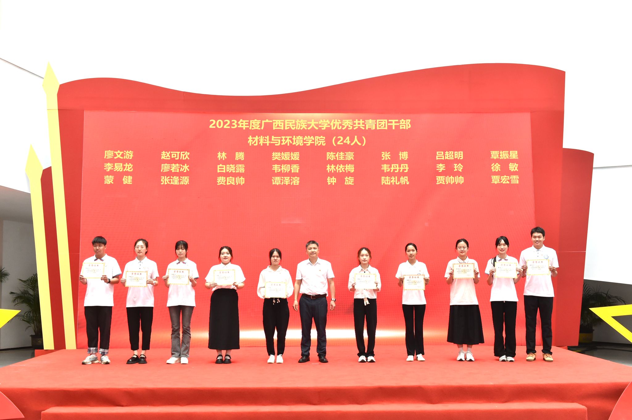 典礼上,学校领导先后为三好学生代表、优秀学生干部代表、优秀共青团员代表、优秀共青团干代表、五四红旗团支部代表、先进班集体代表与优良学风班代表、五星级活力团支部代表、五四红旗团委及先进学生会组织代表、自治区人民政府奖学金代表、国家励志奖学金代表、国家奖学金代表颁奖。