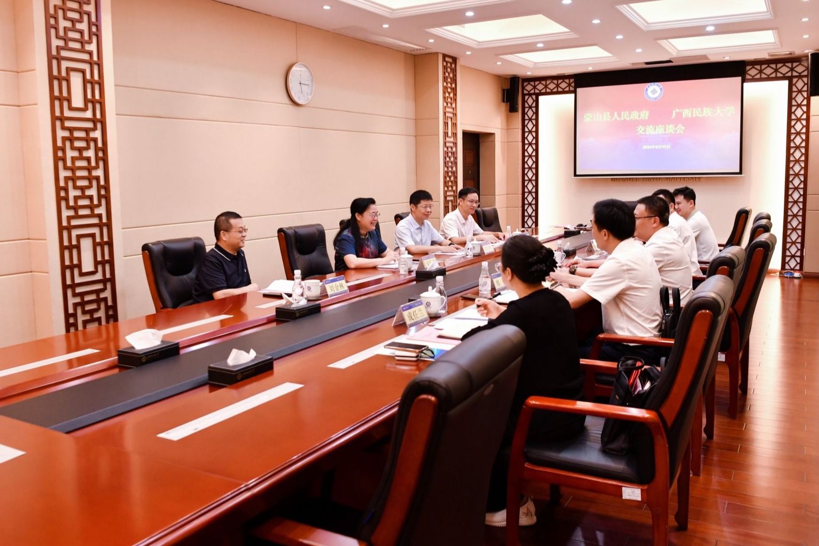 陈坚介绍了蒙山县的发展情况和规划,希望学校通过选派专家团队、学生实习实践等方式,促进蒙山民族特色产业基地与学校人才资源相结合,实现优势互补,共同推动民族产业高质量发展。