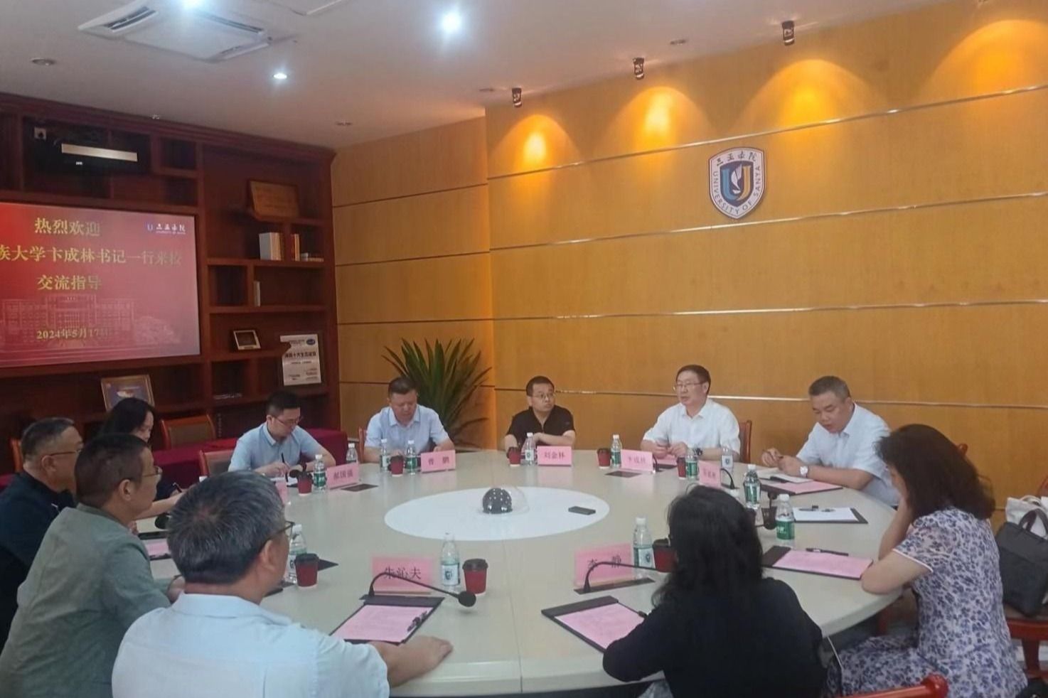 5月17日,澳门网投官方网站党委书记、广西中华民族共同体意识研究院院长卞成林带队到三亚学院洽谈合作事宜。澳门网投官方网站党委副书记陈铭彬,三亚学院理事长、名誉校长、吉利人才发展集团CEO陆丹,三亚学院校长沈建勇,副校长朱沁夫参加座谈会。