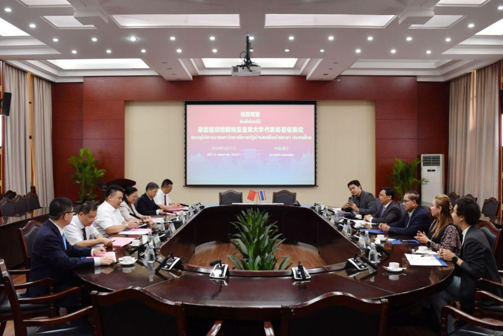【大学生通讯社报道】5月21日下午,校长韦仕珍会见到访的泰国班颂德昭帕亚皇家大学校长卡纳功·沙旺查隆一行。双方在国际合作与交流处会议室会谈,副校长吕俊彪主持座谈会。