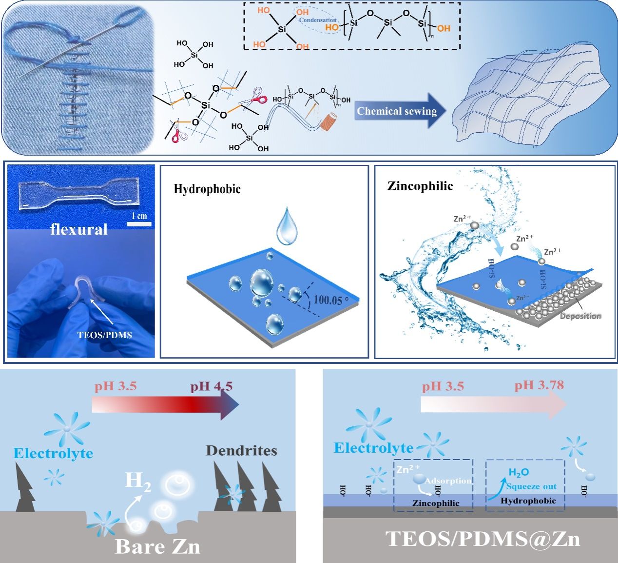 颜东亮教授团队与张培新教授团队合作,提出了通过化学裁剪的方法制备无机有机杂化人工保护层,以解决目前锌离子电池存在的析氢析氧反应,枝晶生长和电解液的腐蚀等问题。此保护层具有柔韧性,可以轻松弯曲。因此,它能在机械应力作用下抑制树枝状突起的生长。此外,该保护层的外表面由疏水链组成,可阻止水分子进入,从而抑制锌金属的腐蚀。保护层中丰富的Si-OH键作为亲锌位点,可加速锌离子的移动。同时,Si-OH键容易与电解质中的水形成氢键,从而抑制析氢析氧反应。由于多种功能基团的协同作用,所构建的人工保护层在电化学方面表现出卓越的性能。