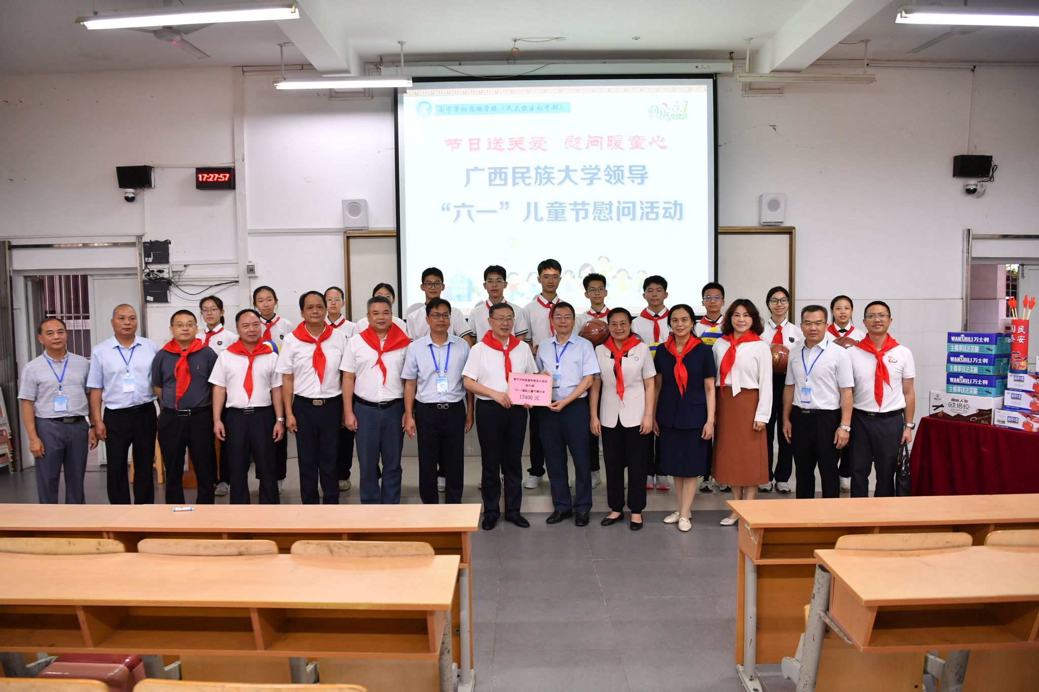 【大学生通讯社报道】5月31日下午,“六一”国际儿童节前夕,澳门网投官方网站党委书记卞成林,校长韦仕珍,校领导陈铭彬、韦雪芳、蔡高根、何立荣到澳门网投官方网站附属幼儿园,南宁市相思湖学校小学部、初中部看望慰问师生,送上节日的祝福。