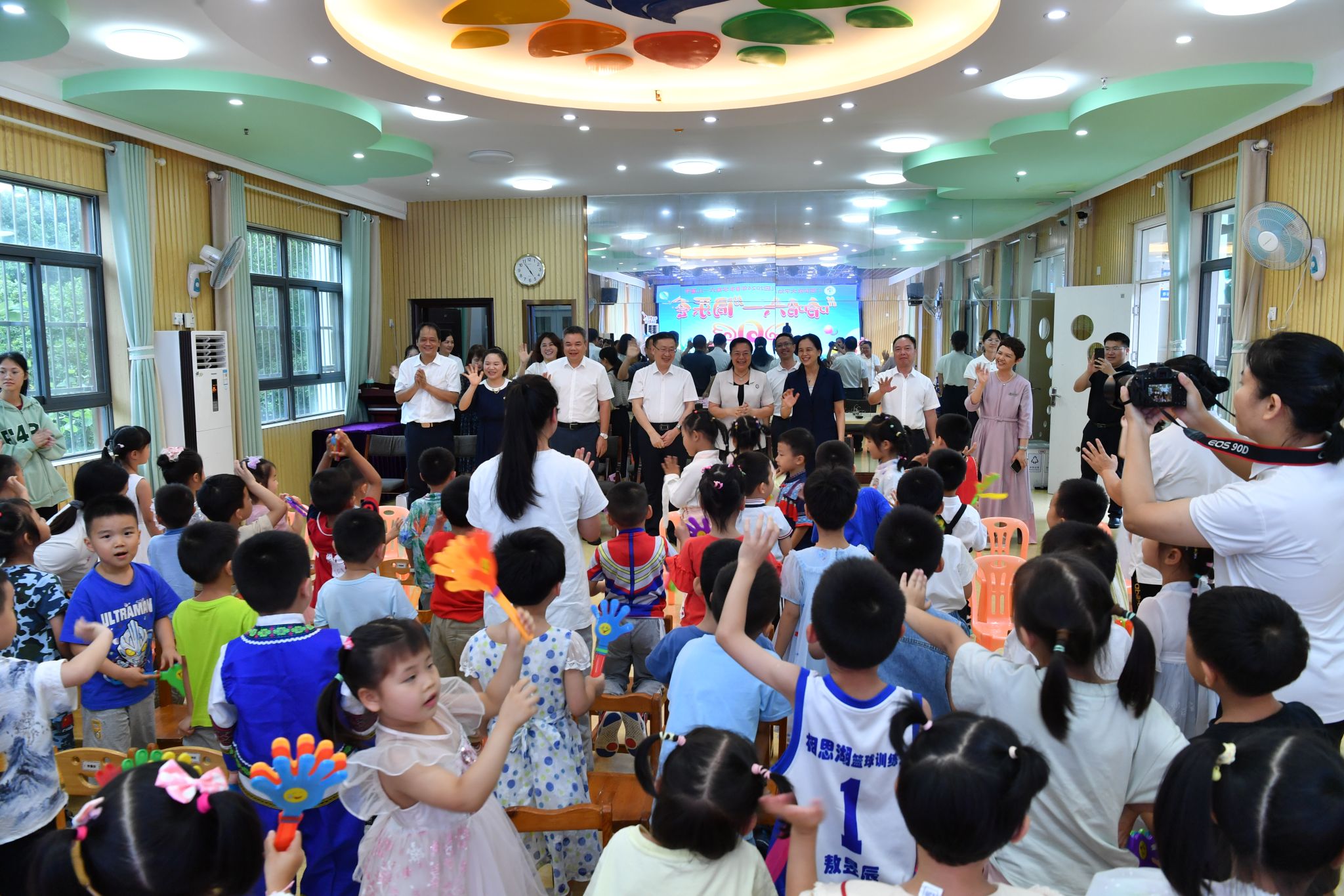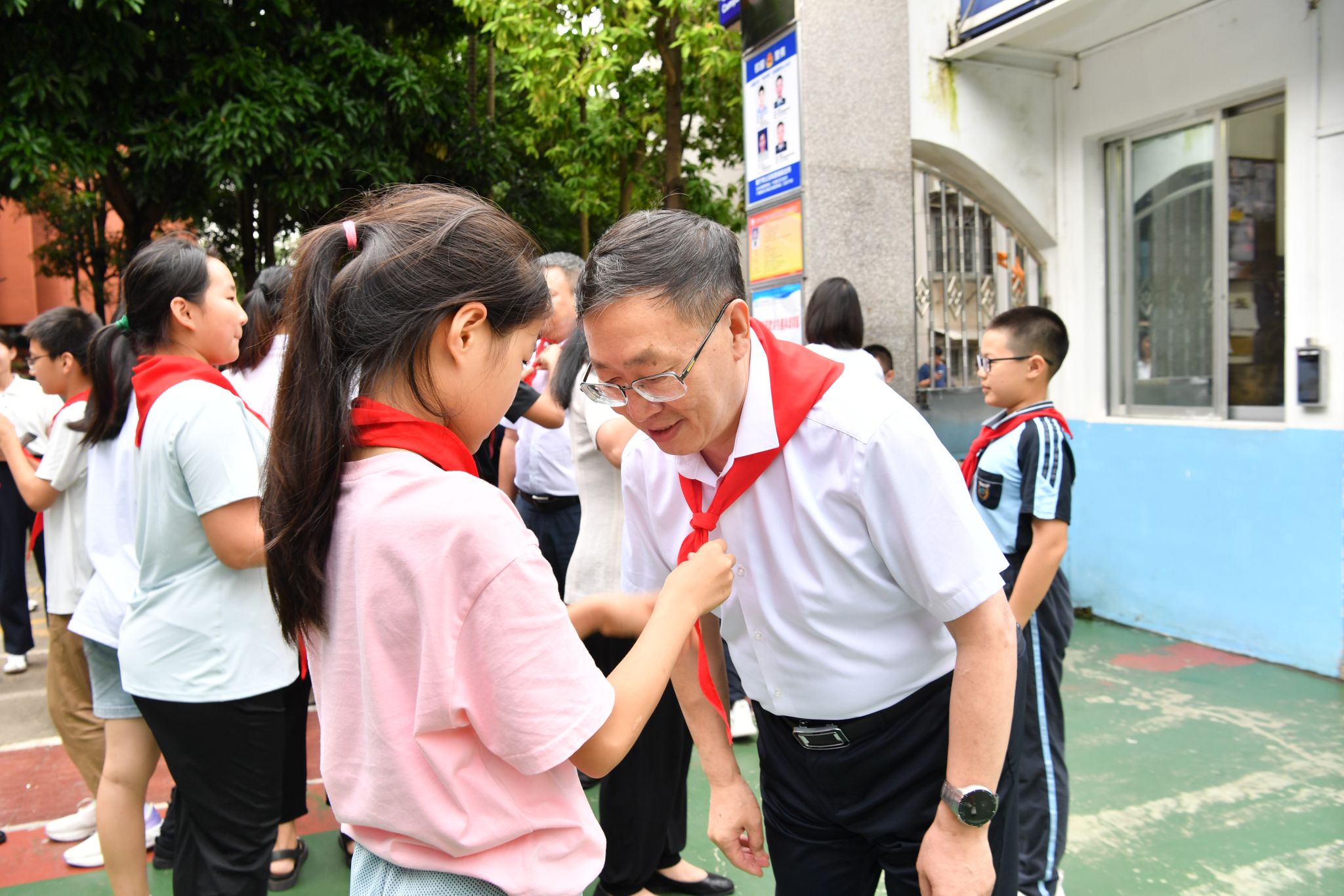 校园里洋溢着节日欢快的气氛。校领导一行观看孩子们为节日准备的歌舞表演,与儿童代表交流互动,赞扬孩子们朝气蓬勃、健康向上的精神风貌,并鼓励孩子们认真学习、加强锻炼,勇于创新,乐于奉献,争做新时代好少年。在小学部、初中部,孩子们为校领导一行佩戴红领巾。