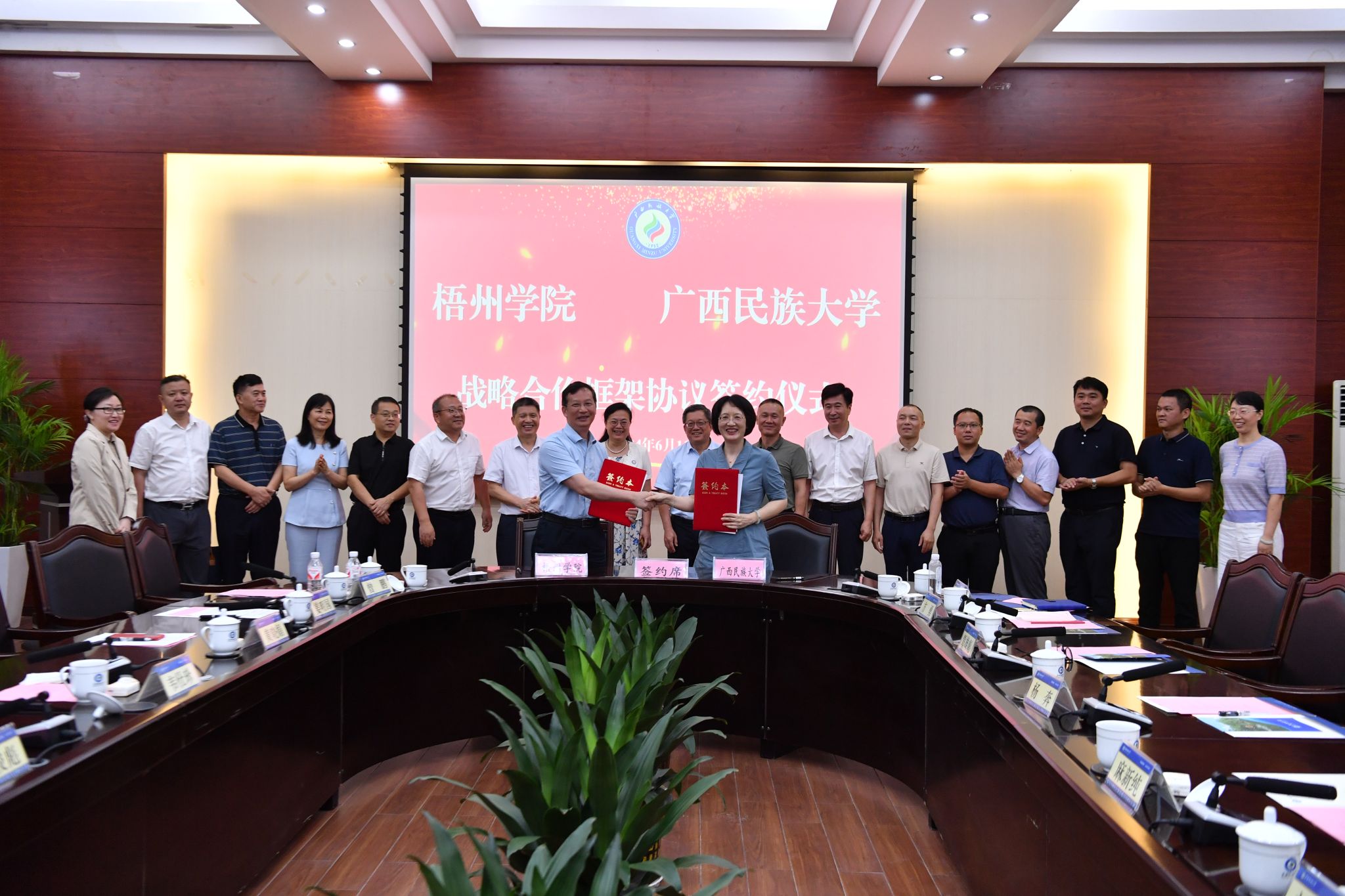 【大学生通讯社报道】6月11日下午,校长韦仕珍会见来校交流的梧州学院校长杨奔一行,双方就学科专业建设、智慧校园建设等方面交流并签署战略合作框架协议。澳门网投官方网站副校长黄晓娟、吕俊彪、姜明国,梧州学院副校长麻新纯、覃雄彪出席座谈会。姜明国主持会议。