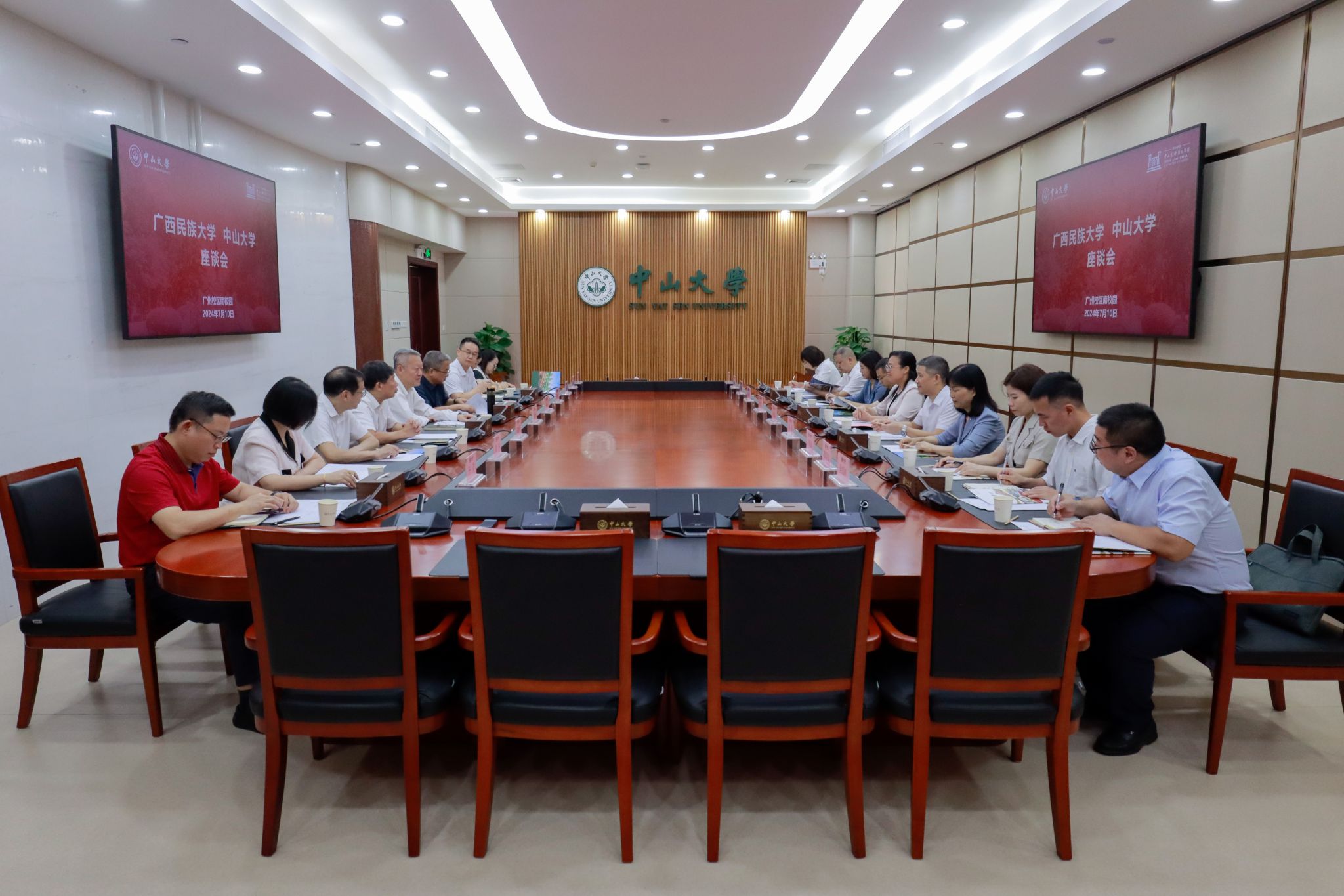 7月10日,校长韦仕珍带队到中山大学开展对口合作学习交流并看望广东校友。当天上午,澳门网投官方网站-中山大学座谈会在中山大学南校园召开,中山大学党委书记陈春生,中山大学常务副校长杨清华,澳门网投官方网站副校长吕俊彪出席座谈会。