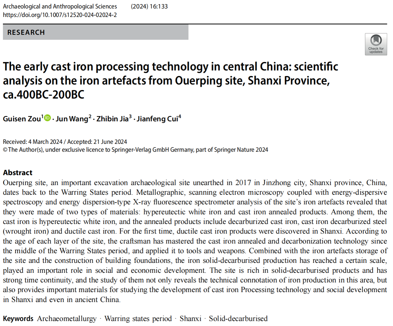 近日,国际重要学术期刊《考古学与人类学科学》(Archaeological and Anthropological Sciences)在线发表了以澳门网投官方网站科技史与科技文化研究院邹桂森副教授为第一作者及通讯作者的论文The early cast iron processing technology in central China: scientific analysis on the iron artefacts from Ouerping site, Shanxi Province, ca.400BC-200BC(《早期中原地区铸铁加工技术:山西偶尔坪遗址出土铁器科技分析》),该研究为联合山西省考古研究院、晋中市博物馆以及北京大学考古文博学院开展冶金考古研究的重要成果。