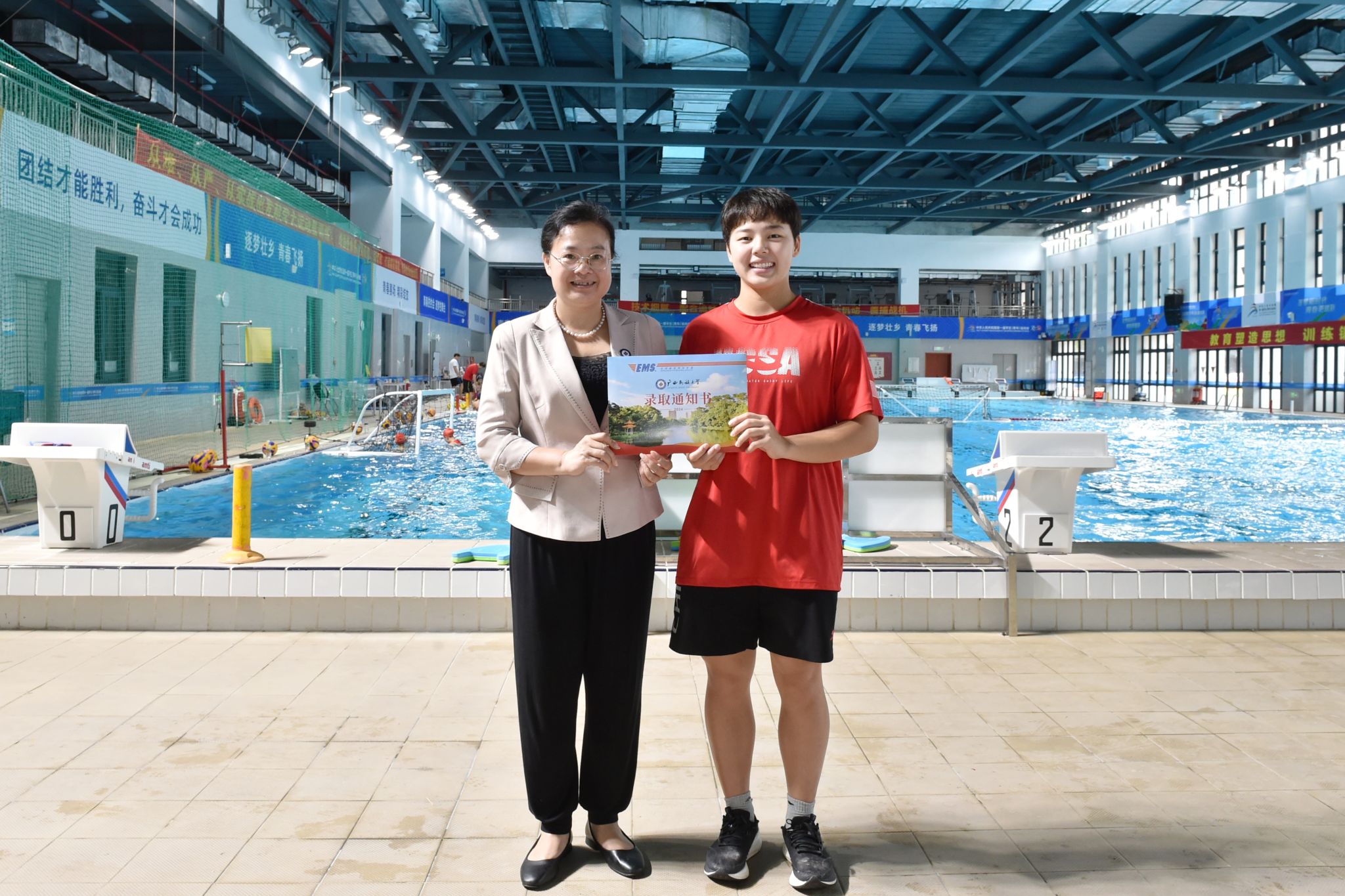 8月1日下午,澳门网投官方网站校长韦仕珍到自治区体育局江南训练基地,看望42名联合培养运动训练专业新生,并为新生代表、第二十三届世界蹼泳锦标赛400米器泳项目冠军姚华莉颁发录取通知书,这是学校2024年首封本科录取通知书。
