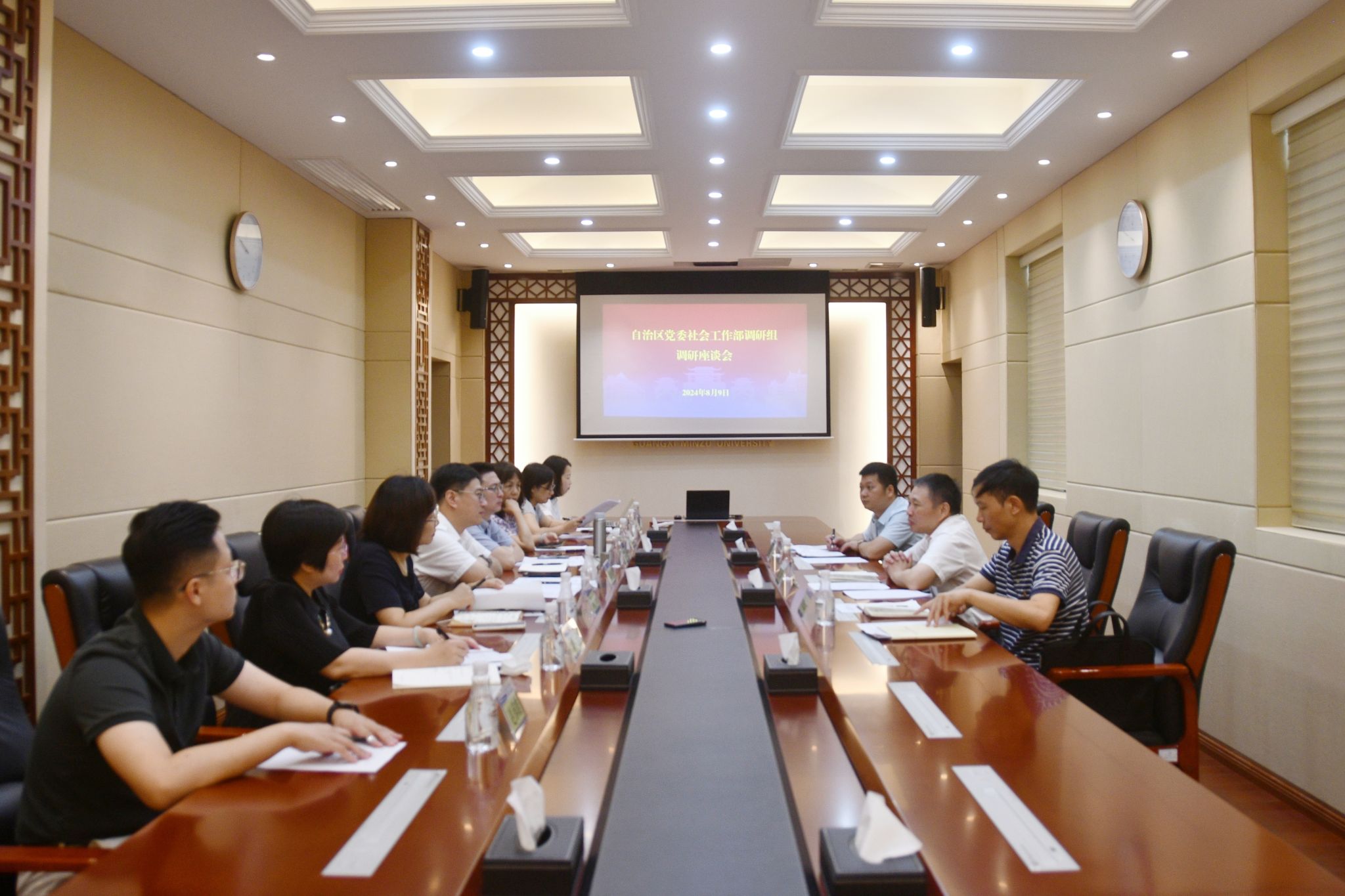 8月9日,学校党委常委、副校长高兴宇与自治区党委社会工作部副部长文琦一行进行座谈,双方就广西互嵌式社区治理与构筑中华民族共有精神家园建设创新实践探索的经验做法进行交流。(初审:刘金林 复审:荣子卿 终审:王文娟)