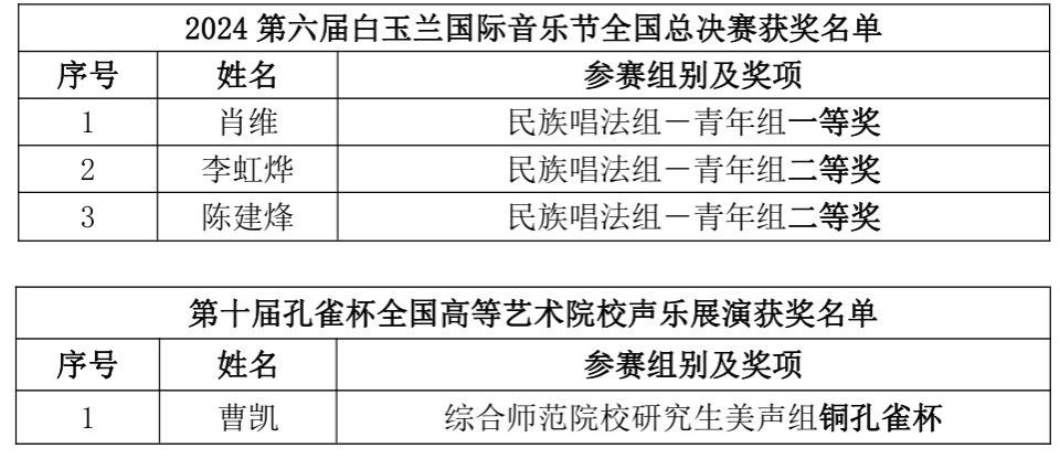 近日,2024第六届白玉兰国际音乐节全国总决赛、第十届孔雀杯全国高等艺术院校声乐展演落幕,澳门网投官方网站艺术学院/民歌学院参赛学生在第六届白玉兰国际音乐节全国总决赛中斩获一等奖1项、二等奖2项,在第十届孔雀杯全国高等艺术院校声乐展演荣获“铜孔雀杯”1项。(初审:吴小军 编辑:陈水兰 复审:荣子卿 终审:王文娟)