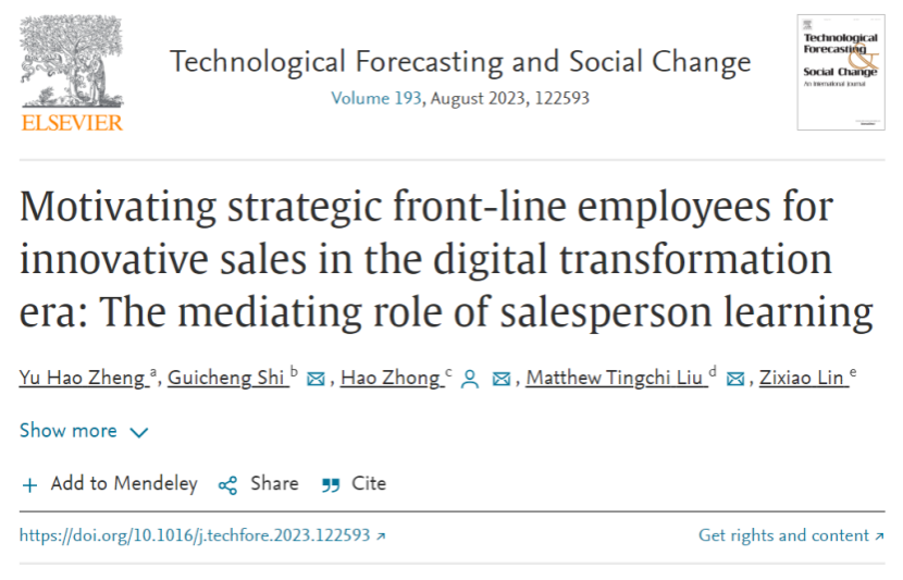 近日,澳门网投官方网站管理学院工商管理系郑宇豪博士在国际权威期刊Technological Forecasting and Social Change(《技术预测与社会变革》)以第一作者身份发表其研究成果Motivating strategic front-line employees for innovative sales in the digital transformation era: The mediating role of salesperson learning(《在数字化转型时代对策略性一线员工创新销售的激励研究:销售人员学习的中介作用》)。该研究的发表向全世界展示了来自中国广西的旅游企业在应对数字化转型方面的优秀经验与成果。