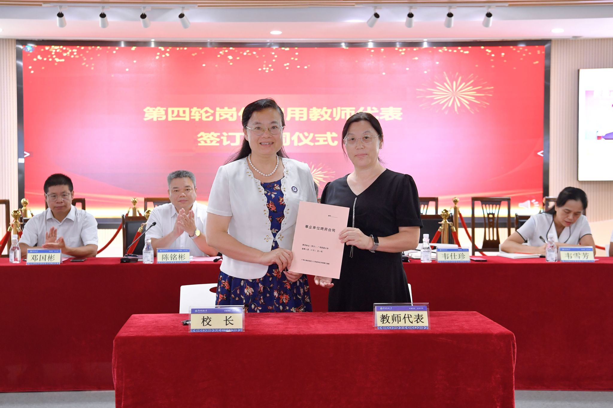会上,教师代表聘用合同签订仪式举行。韦仕珍与第四轮岗位聘用教师代表马克思主义学院谭元敏教授、文学院李惠玲教授等五位教师代表签订聘用合同书并合影留念。