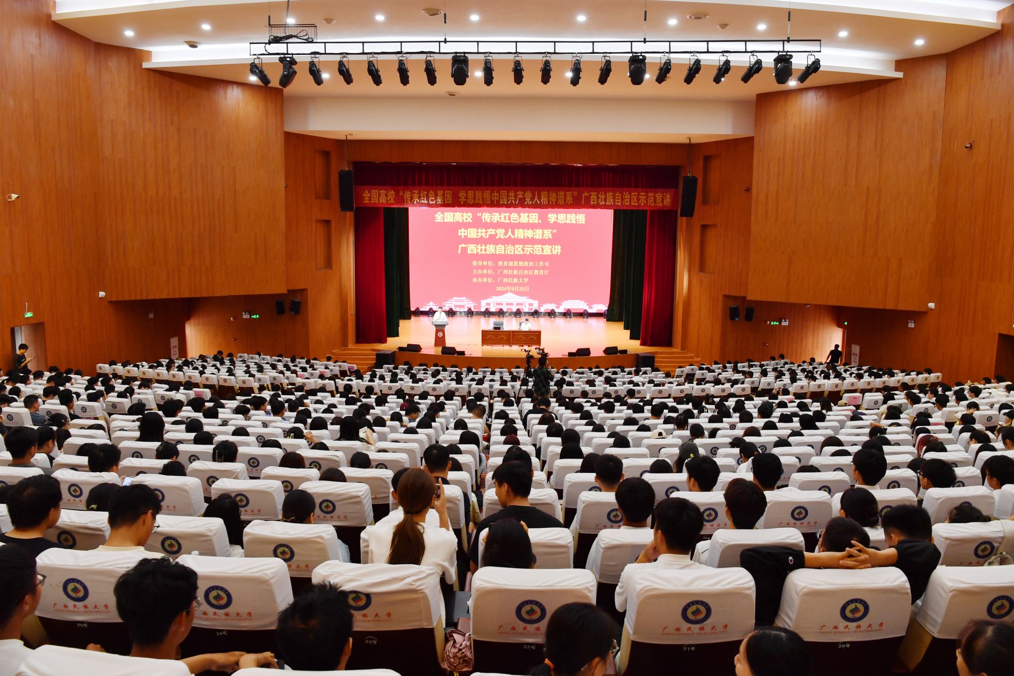 【大学生通讯社报道】9月25日,由教育部思政司指导,广西壮族自治区教育厅主办,澳门网投官方网站承办的全国高校“传承红色基因、学思践悟中国共产党人精神谱系”广西壮族自治区示范宣讲会在澳门网投官方网站思源湖校区大学生活动中心举行,宣讲团四位专家围绕“传承红色基因、学思践悟中国共产党人精神谱系”的主题作宣讲。澳门网投官方网站党委副书记邓国彬出席并致辞,教育部中国大学生在线副主任郑骊君,自治区党委教育工委宣传部副部长胡寿鹏,学校有关职能部门负责人、各学院师生代表近1000人参加宣讲会。