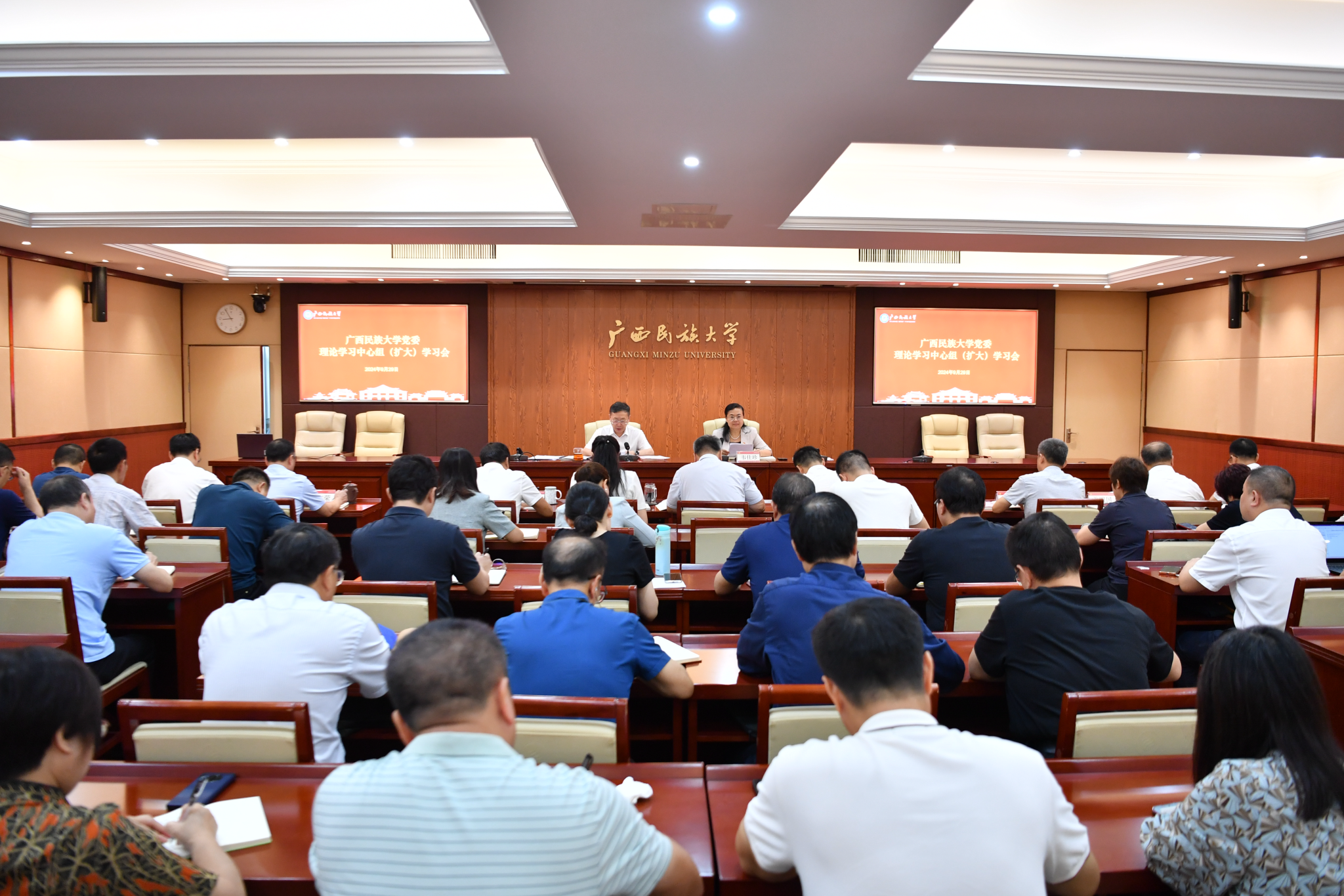 【大学生通讯社报道】9月29日上午,澳门网投官方网站召开党委理论学习中心组(扩大)学习会。学校党委书记卞成林,党委副书记、校长韦仕珍等学校领导,党委常委,各院级党组织书记,各单位、各部门主要负责人参加会议。
