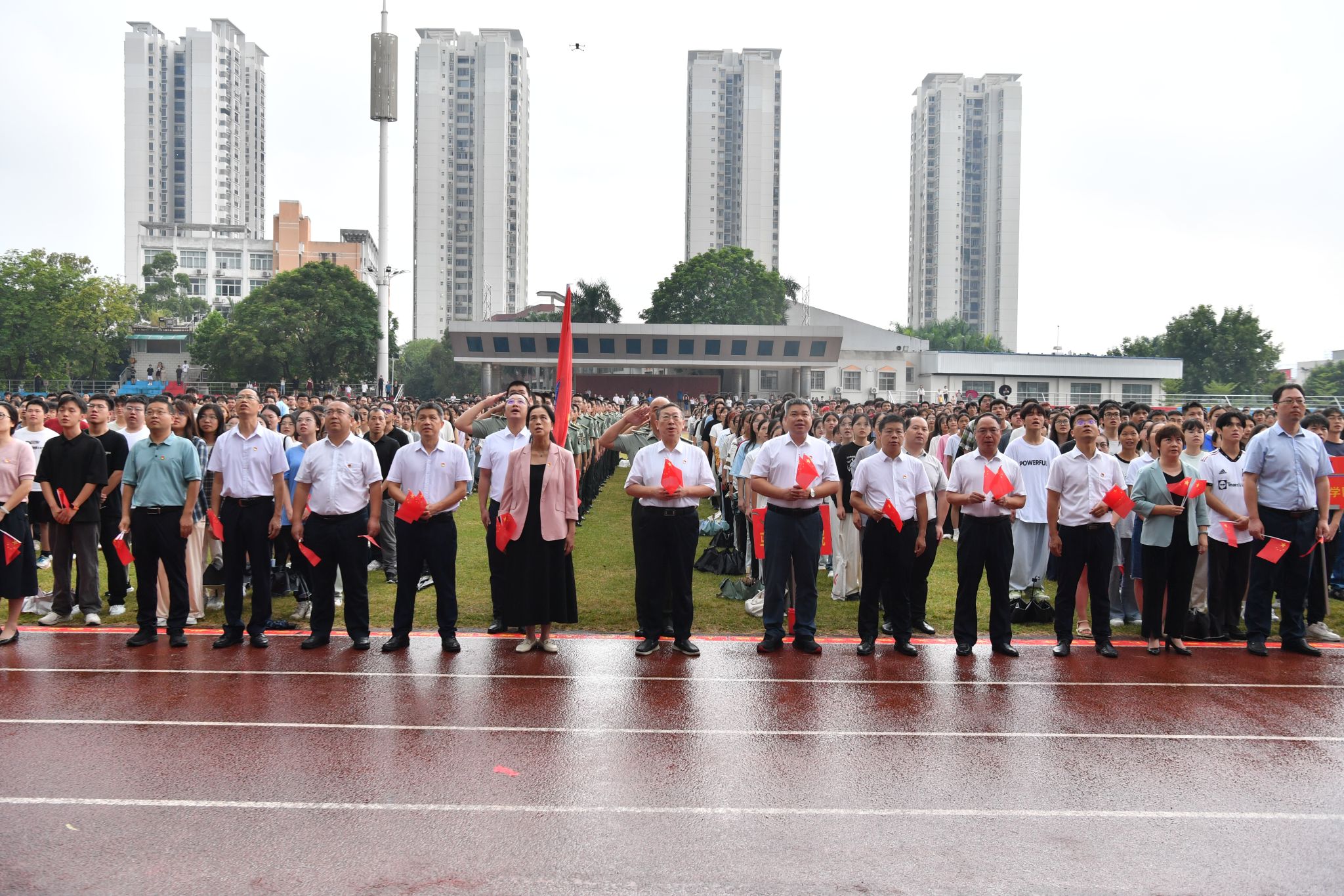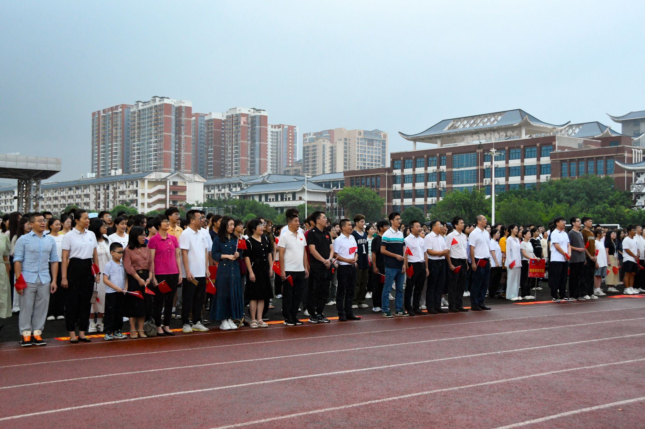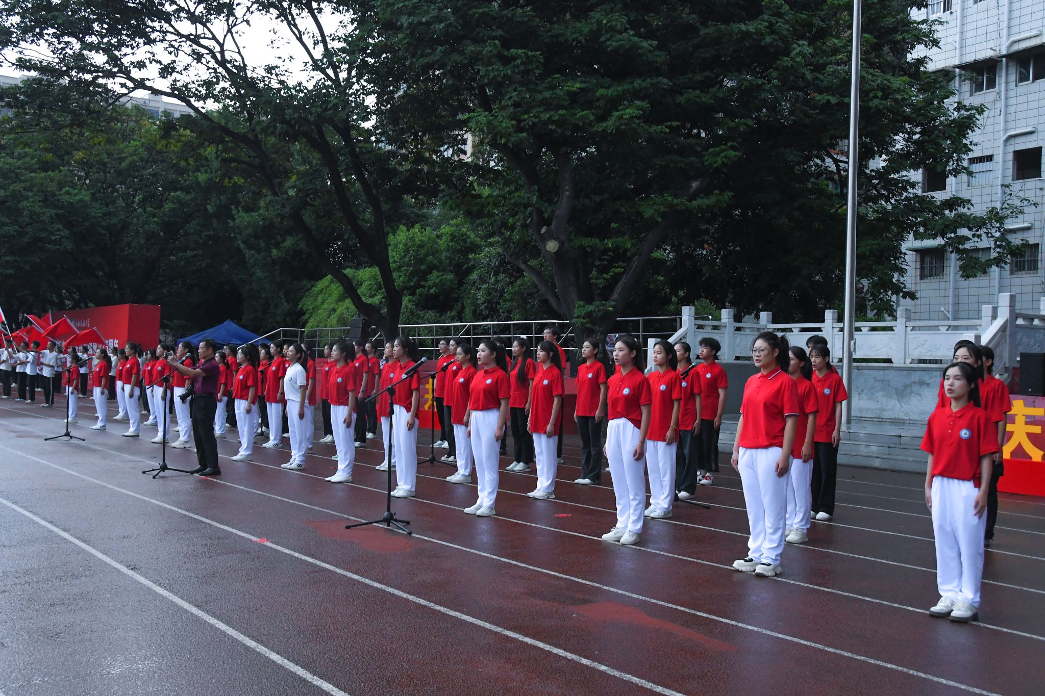 “我爱你中国亲爱的母亲,我为你流泪也为你自豪……”由学生代表组成的合唱团深情合唱《我爱你中国》,师生们或轻声哼唱,或高声吟诵,每一个音符都饱含着对祖国的深情厚谊,每一个节奏都传递着对祖国的无限热爱。