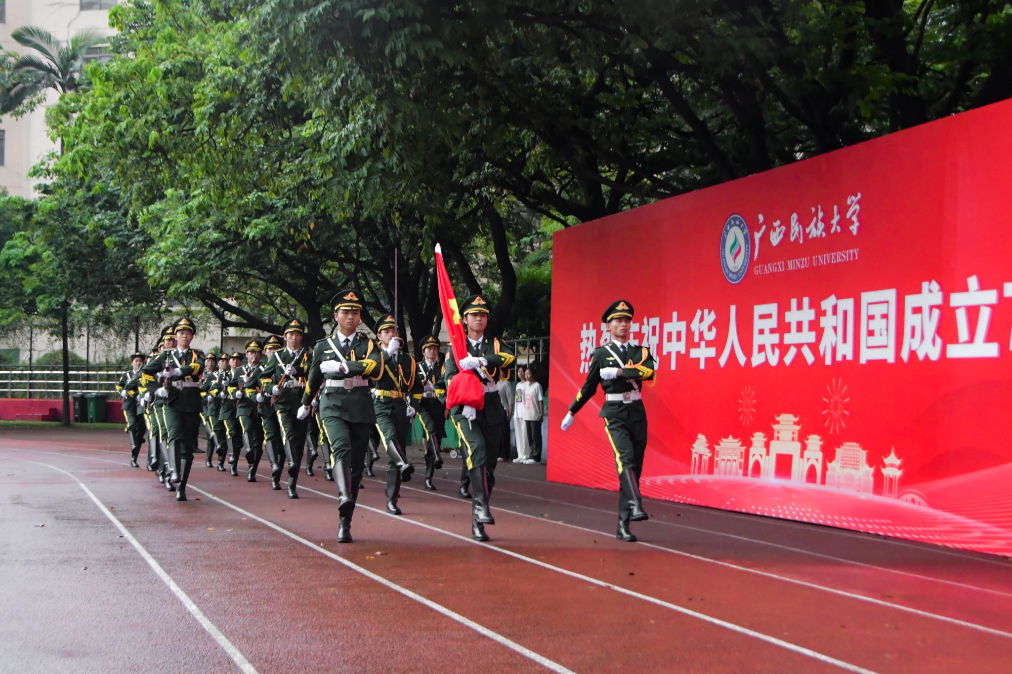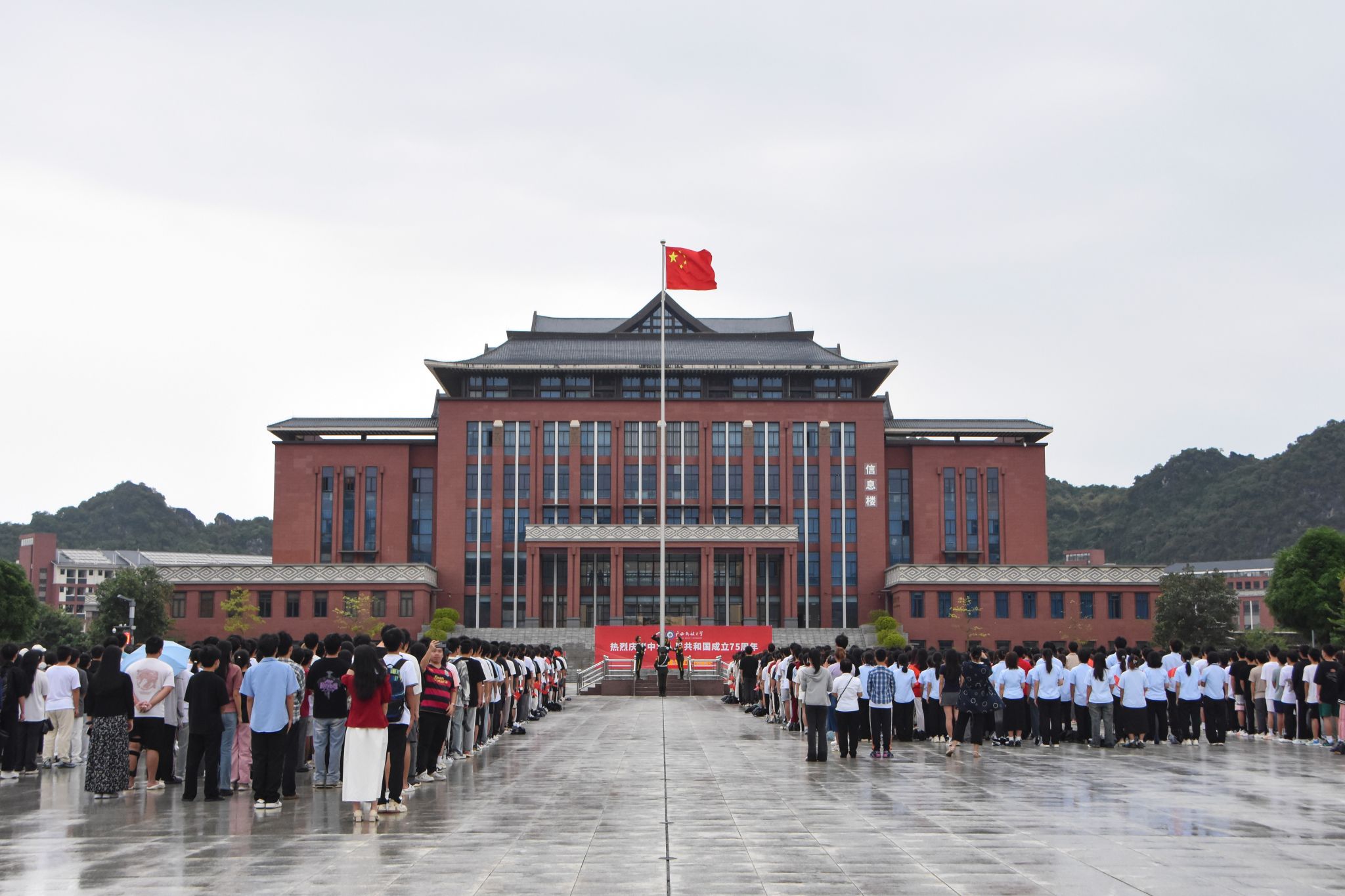 【大学生通讯社报道】中华广袤同此刻,国歌激昂随风扬。10月1日,澳门网投官方网站在相思湖校区、思源湖校区、武鸣校区举行升旗仪式。学校党委书记卞成林在相思湖校区出席活动。学校党委副书记、校长韦仕珍在民族广场参加自治区组织的升旗仪式。校领导陈铭彬、韦雪芳、邓国彬、吕俊彪、何立荣、姜明国及师生代表在校参加,共同庆祝中华人民共和国成立75周年。