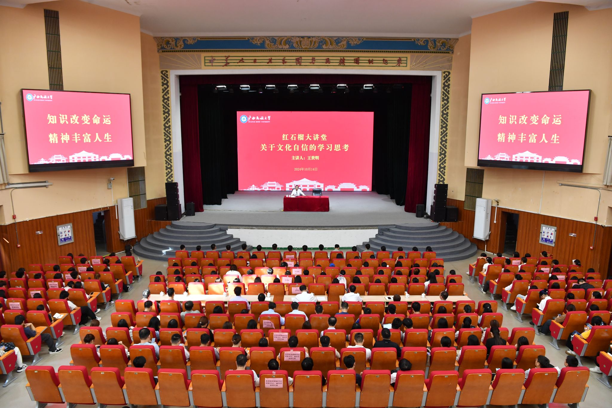 卞成林在主持报告会时指出,希望师生们要深入学习贯彻习近平文化思想,全面贯彻落实党的二十大和二十届二中、三中全会精神,贯彻落实习近平总书记关于广西工作论述的重要要求,加强党的全面领导,以铸牢中华民族共同体意识为主线,坚定深沉的文化自信、保持高度的文化自觉,不断提升自身文化素养,努力成为勇担民族复兴大任的时代新人。