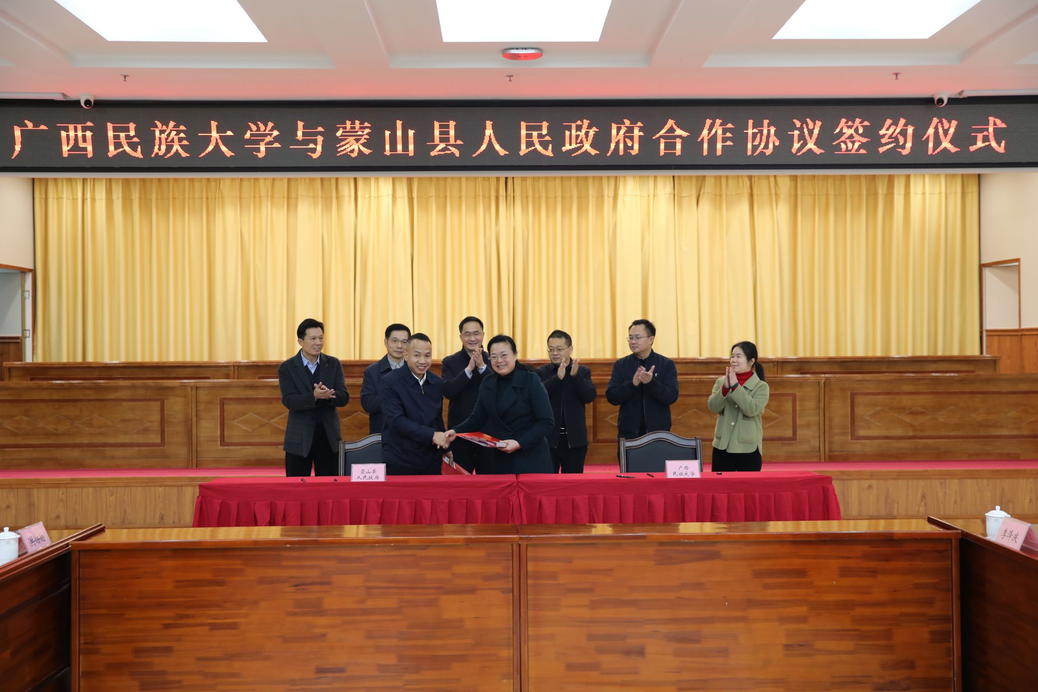 13日,澳门网投官方网站与梧州市蒙山县人民政府合作协议签约仪式在蒙山县人民政府办公楼举行。韦仕珍、蒙山县委书记张银岳、县人大常委会主任何健出席仪式。蒙山县委常委、统战部部长、副县长韩格主持签约仪式。