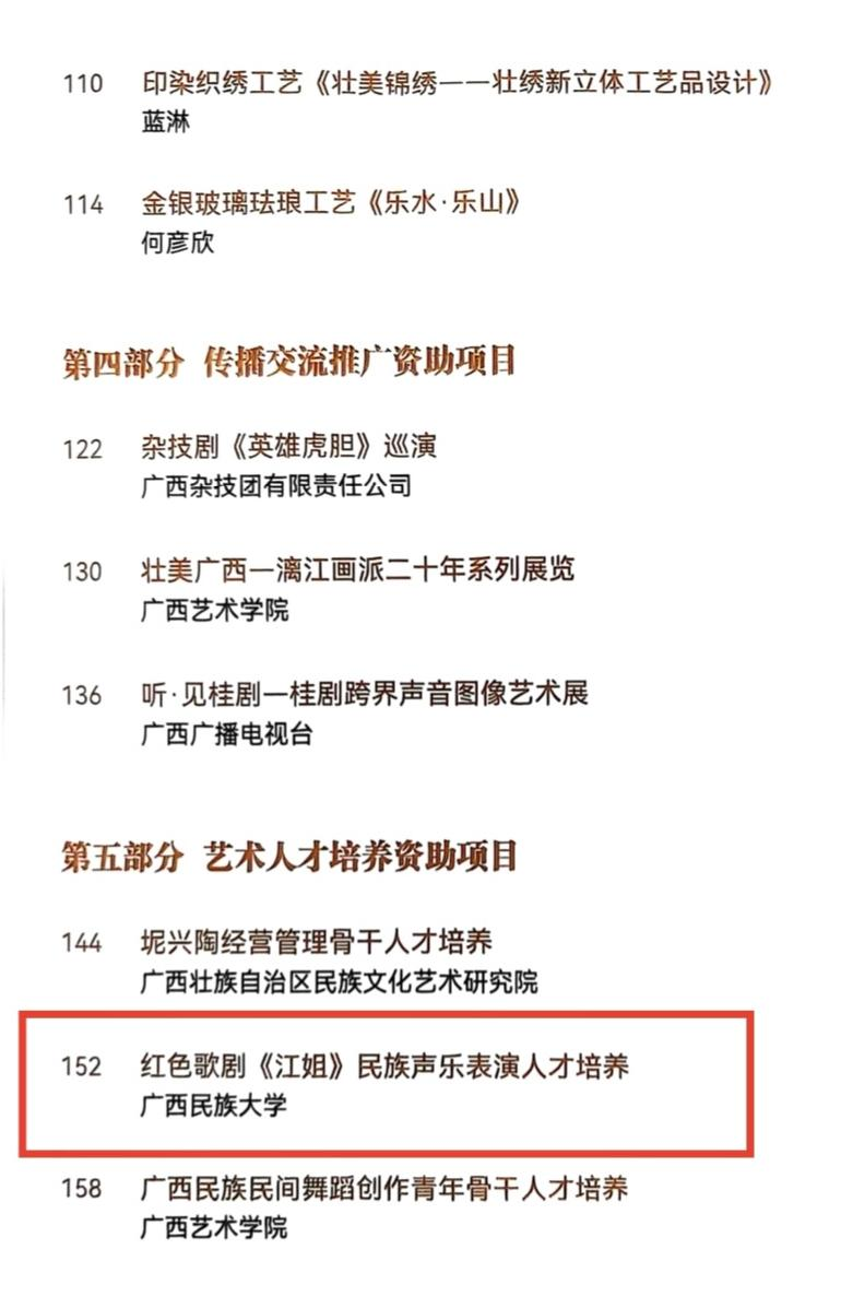 近日,广西艺术基金公布了《一般资助项目(2024年度)案例选编》,澳门网投官方网站《红色歌剧〈江姐〉民族声乐表演人才培养》项目作为优秀案例选编入册。
