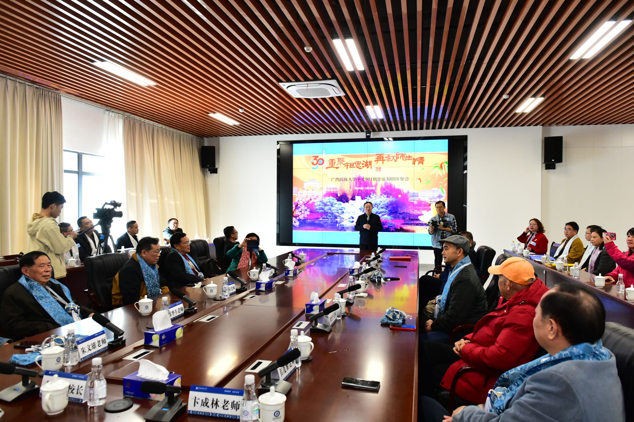 韦仕珍对校友们表示诚挚问候,简要介绍了学校发展情况。韦仕珍表示,当前学校办学条件不断优化,为广大师生提供了更为广阔的学习与生活空间。下一步,学校将坚定不移地以铸牢中华民族共同体意识为主线,不断提升学校的学术水平与科研实力,全力建设好博士点,进一步深化国际化办学特色,建设特色鲜明的高水平现代化综合大学,培养更多优秀人才,为教育强国建设贡献力量。