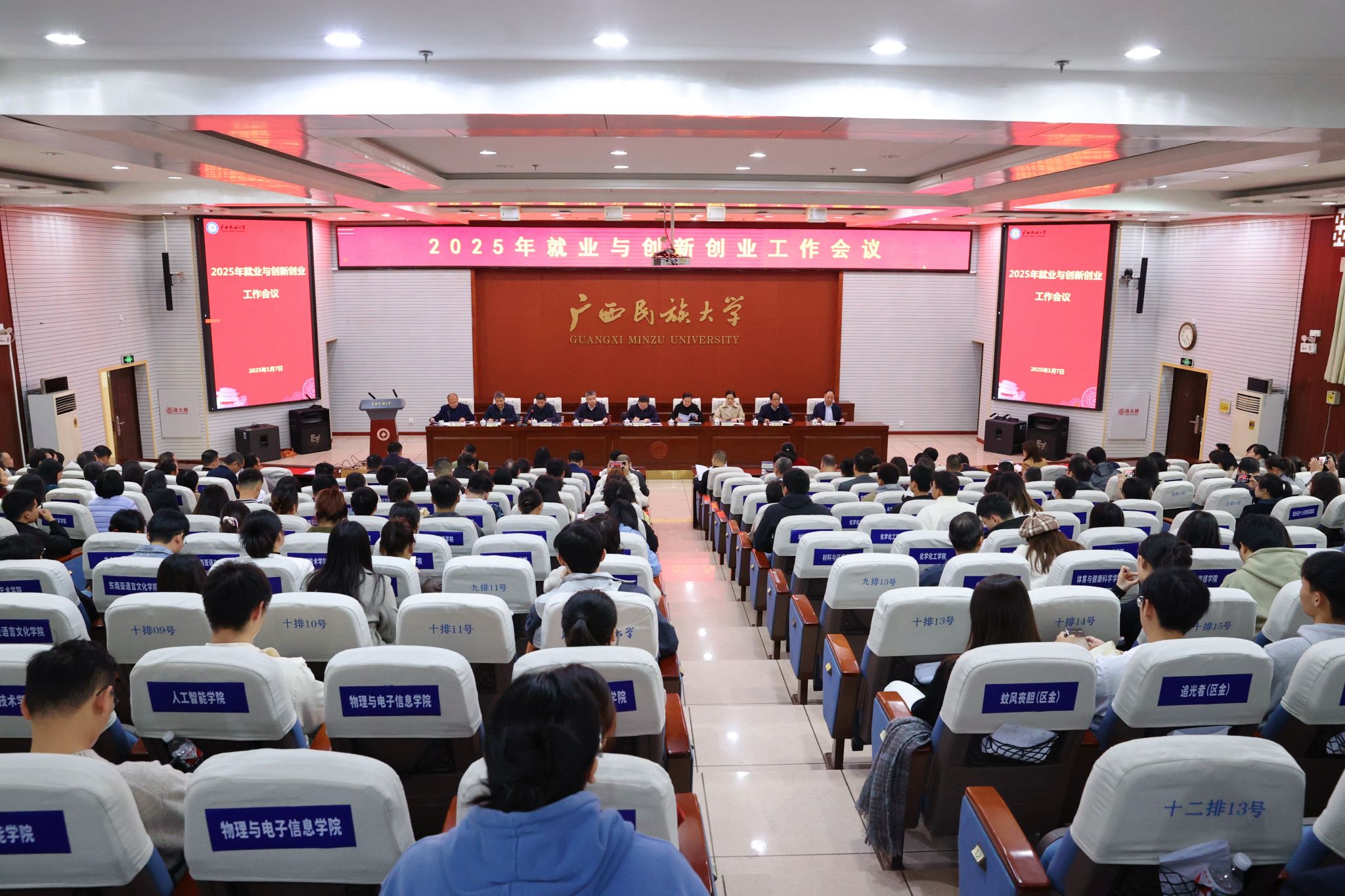1月7日下午,澳门网投官方网站2025年就业与创新创业工作会议暨2025年中国国际大学生创新大赛选拔赛启动仪式在科技楼报告厅举行。学校党委书记卞成林,党委副书记、校长韦仕珍,校领导陈铭彬、韦雪芳、邓国彬、蔡高根、吕俊彪、何立荣、姜明国等出席会议。有关职能部门负责人及各学院师生代表与会。会议由学校党委副书记邓国彬主持。