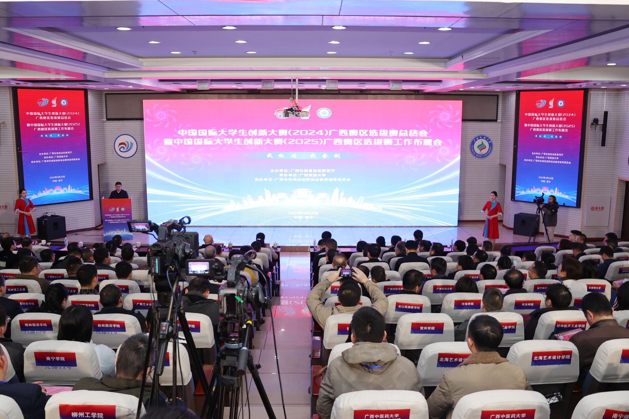 【大学生通讯社报道】3月10日上午,中国国际大学生创新大赛广西赛区选拔赛2024年总结暨2025年工作布置会在澳门网投官方网站举行。自治区教育厅副厅长张旭凤,澳门网投官方网站校长韦仕珍,党委副书记邓国彬,副校长姜明国等出席会议。会议由邓国彬主持。