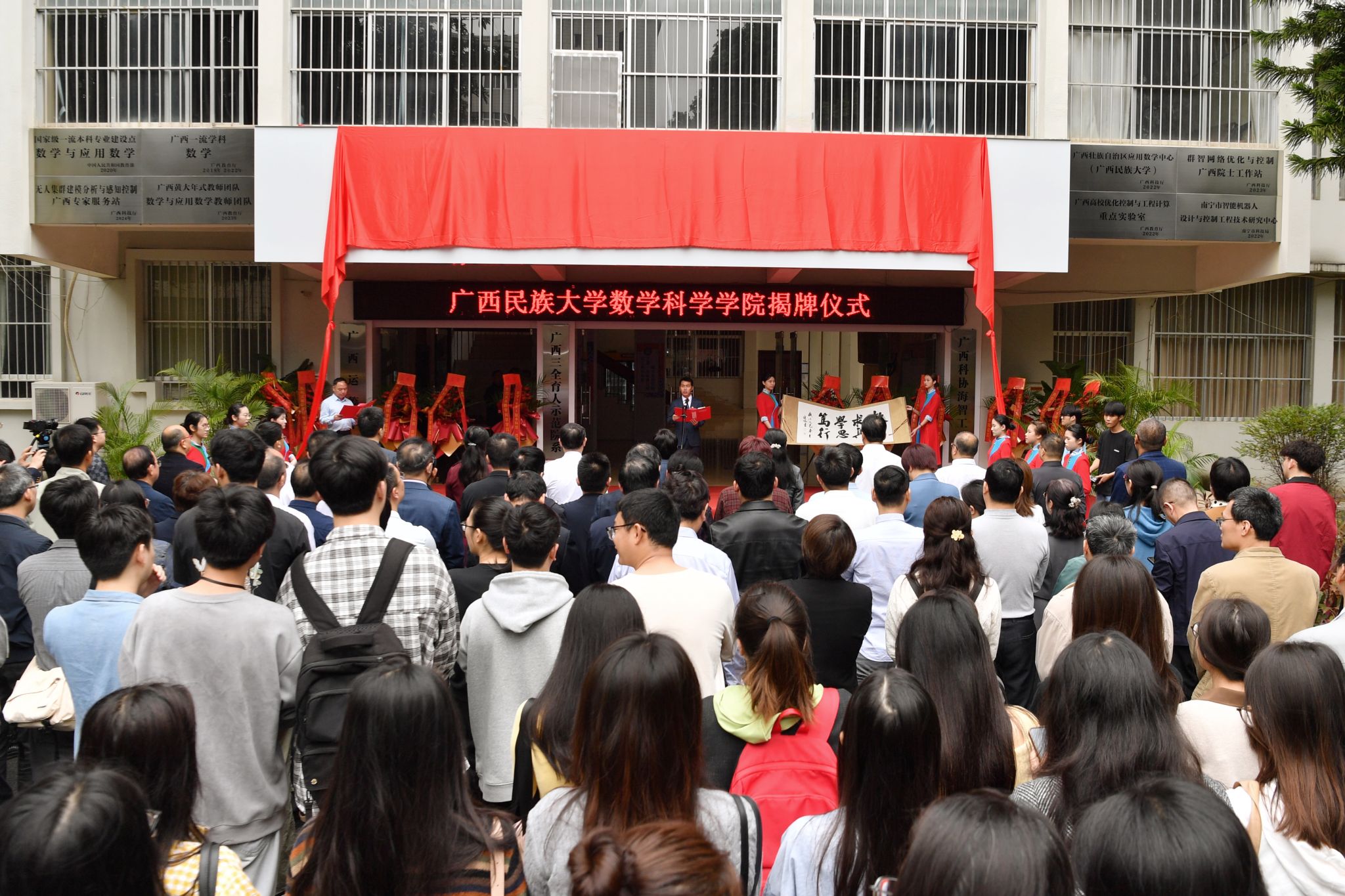 【大学生通讯社报道】3月14日上午,澳门网投官方网站数学科学学院揭牌仪式在创新楼举行。学校党委书记卞成林,校长韦仕珍出席揭牌仪式。全体在家校领导,知名数学家,广西数学会代表,各学院和职能部门负责人及数学科学学院退休教师代表、校友代表、合作单位代表、师生代表参加揭牌仪式。副校长何立荣主持揭牌仪式。