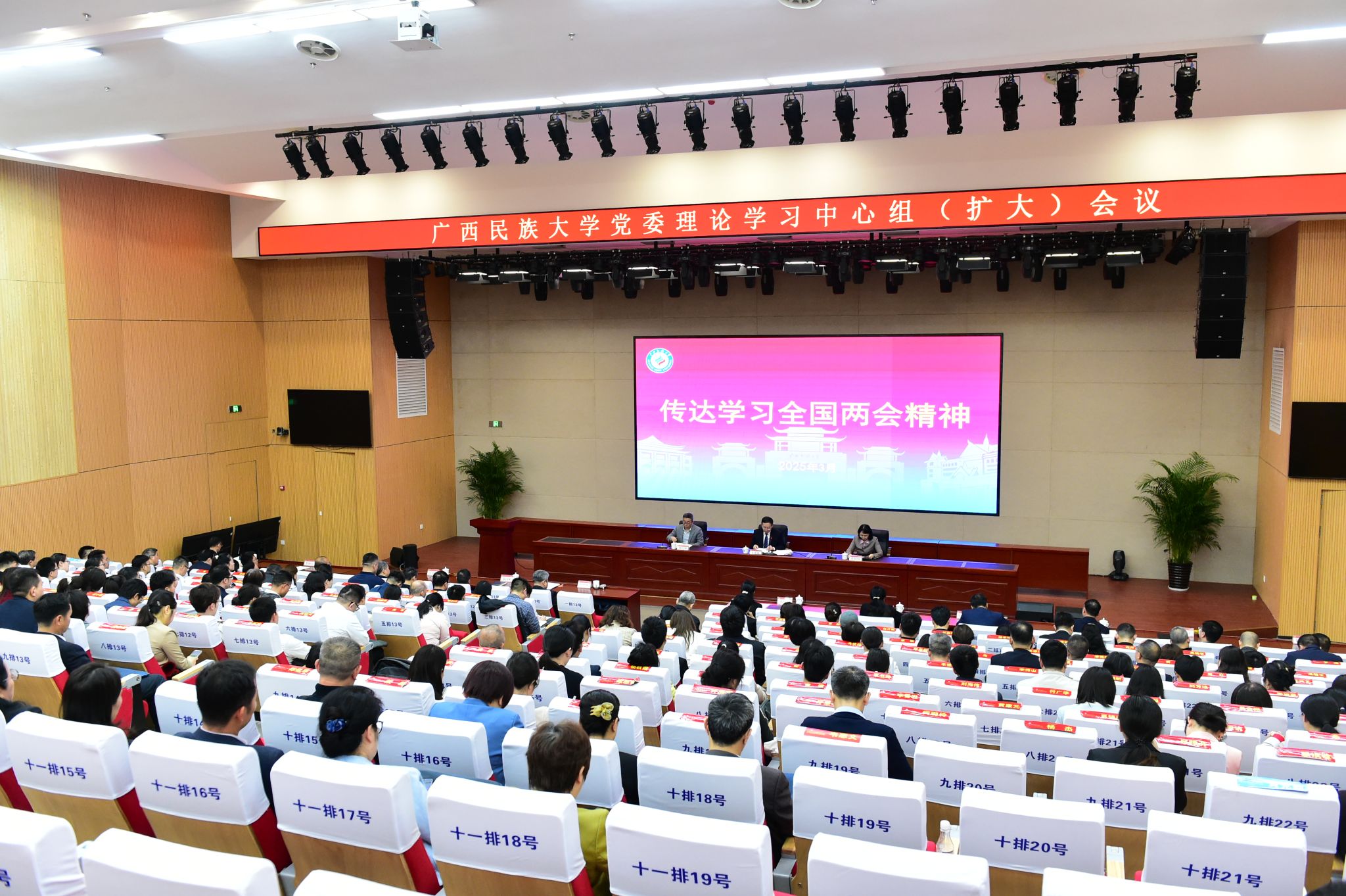 3月15日下午,澳门网投官方网站召开党委理论学习中心组(扩大)学习会,传达学习十四届全国人大三次会议、全国政协十四届三次会议精神。校党委书记卞成林主持会议并传达全区传达贯彻全国两会精神大会精神。全国政协委员、民进广西区委副主委、副校长黄晓娟,全国人大代表、自治区文联主席、澳门网投官方网站文学影视创作中心主任田代琳教授分别传达全国两会精神。