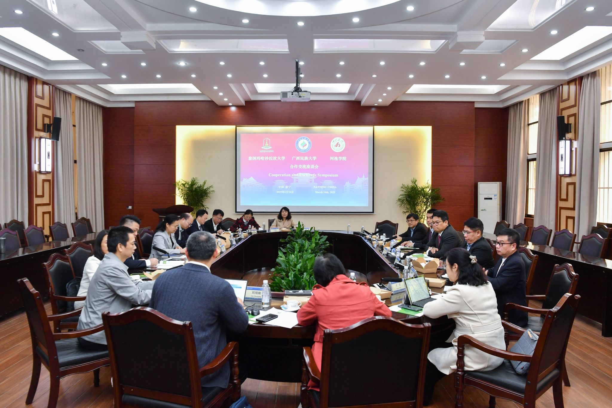 韦仕珍介绍我校人才培养体系、教师与科研团队建设、留学生规模及办学特色等。韦仕珍表示,我校秉持促进国际交流与合作的责任与使命,希望借鉴玛哈沙拉坎大学在传统医药现代化方面的经验,充分发挥河池学院所在地的自然资源优势,共同筹建现代化生物制药产学研基地,实现资源共享与优势互补。