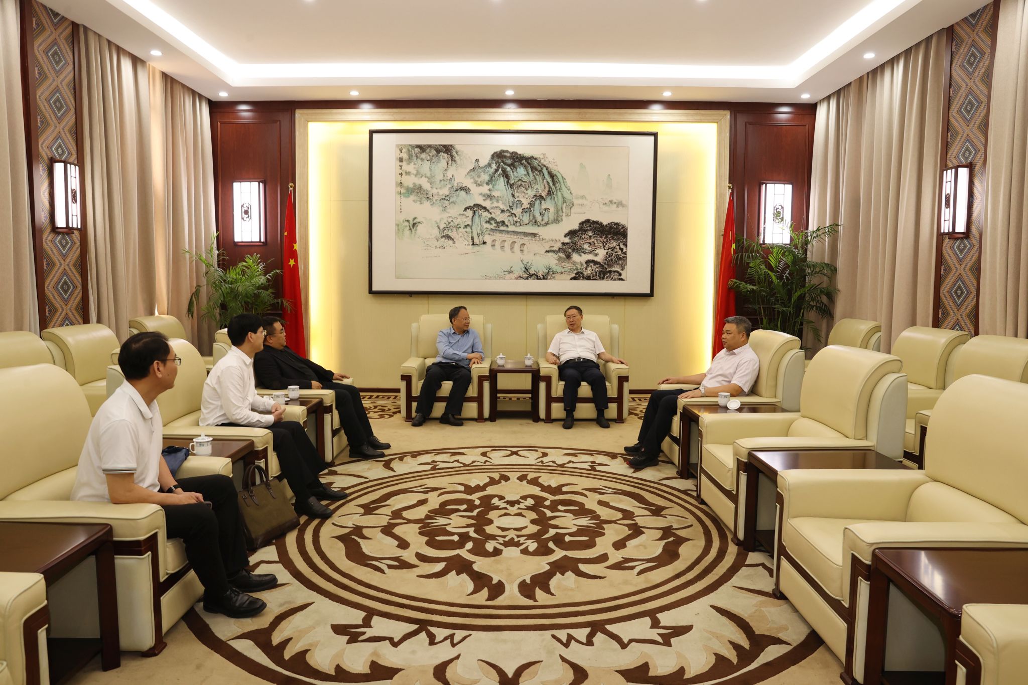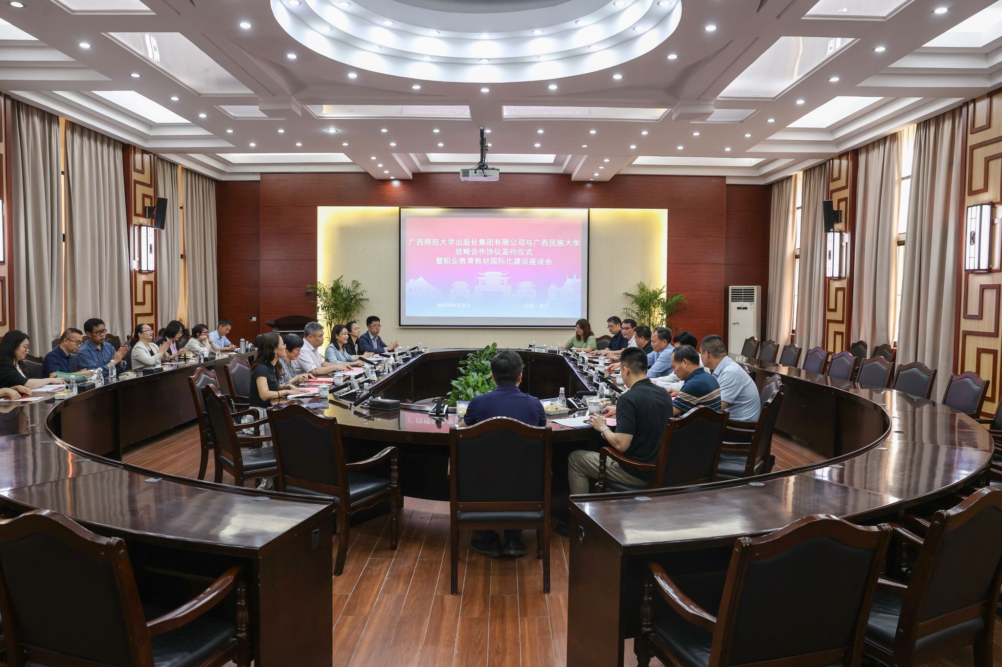 【大学生通讯社报道】4月25日上午,广西师范大学出版社集团有限公司党委书记、董事长黄轩庄一行到澳门网投官方网站交流。校党委书记卞成林会见黄轩庄一行,校党委副书记陈铭彬出席双方举行的职业教育教材国际化建设座谈会。