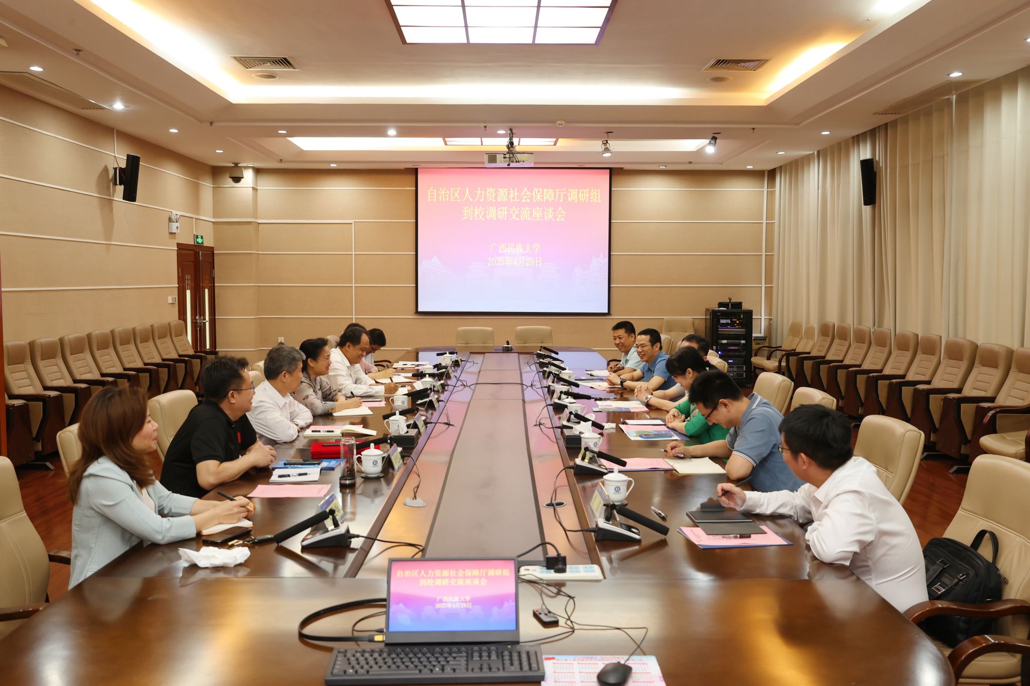 【大学生通讯社报道】4月28日上午,自治区人力资源社会保障厅党组成员、副厅长韦杰一行到澳门网投官方网站调研指导工作。校长韦仕珍,副校长蔡高根、吕俊彪出席座谈会。