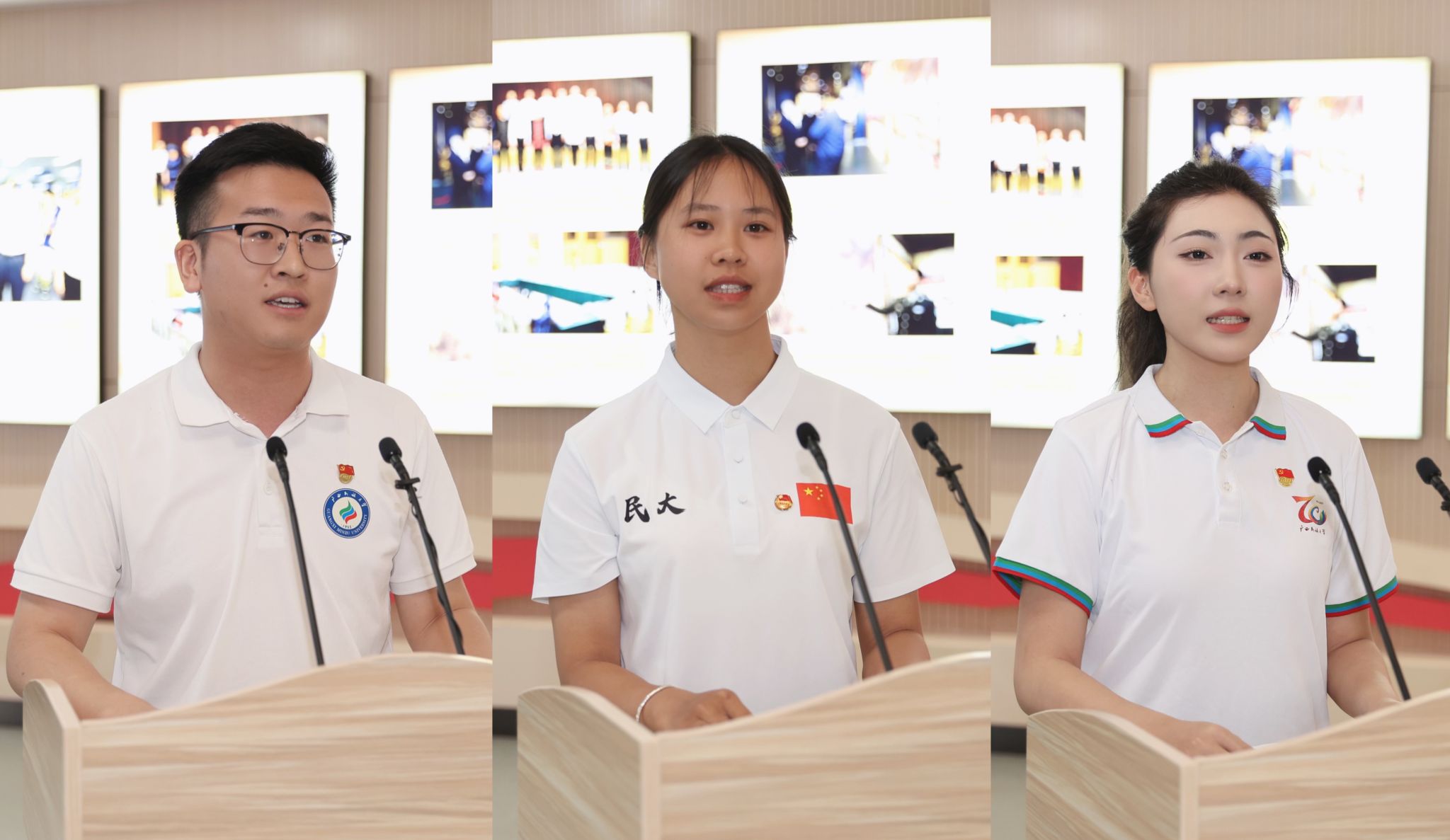 在校生代表、2022级播音与主持艺术专业关怀、2022级体育教育专业梁环宇、2023级生物与医药专业蒙柳青分别从志愿服务、体育竞技、科技创新方面分享了自己的成长故事,充分展现民大学子用实际行动践行新时代青年的责任和担当。(初审:吴家荣 复审:潘之铭 终审:孙寿媚)