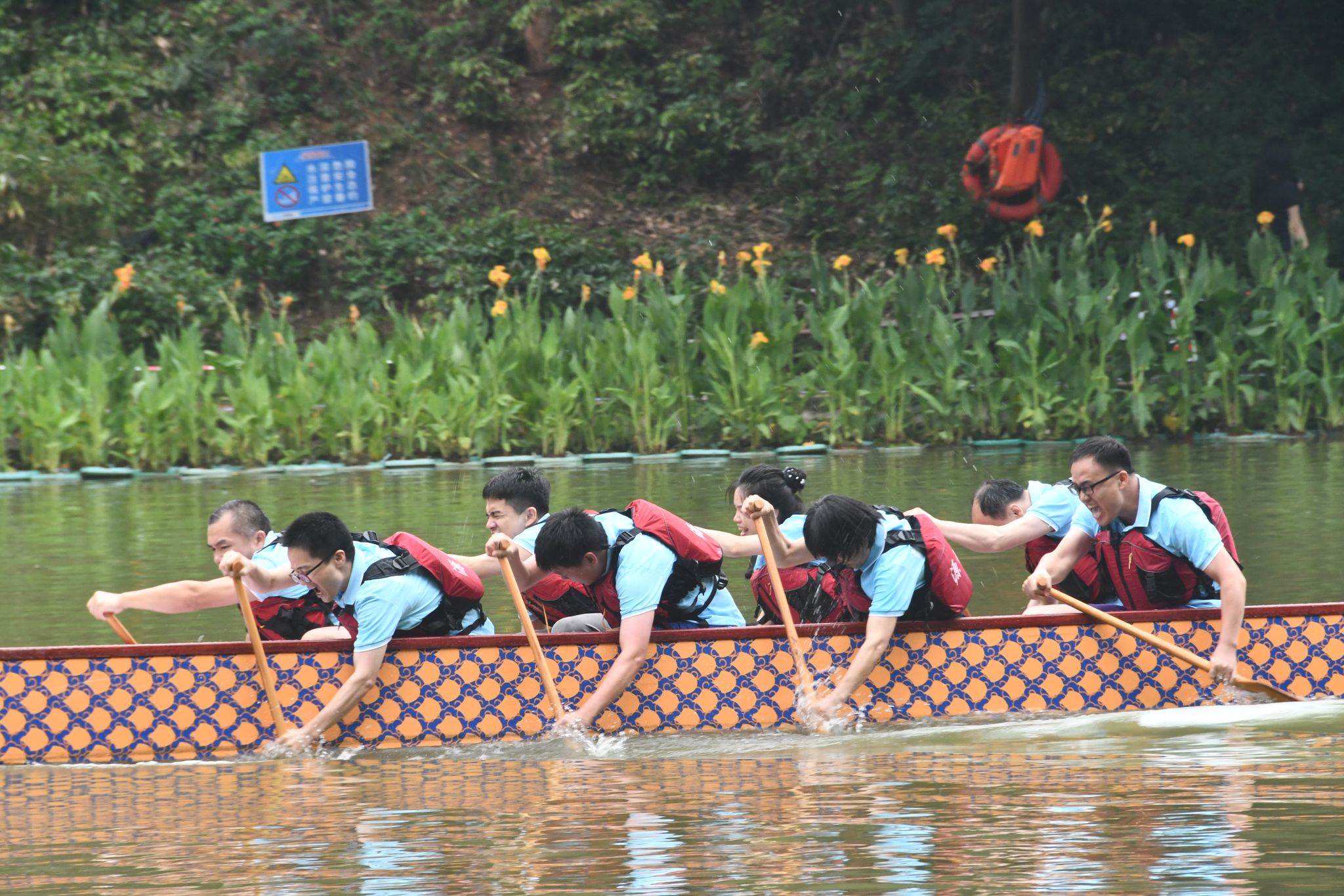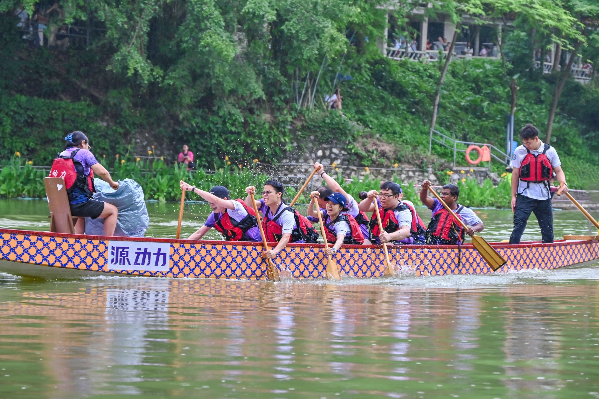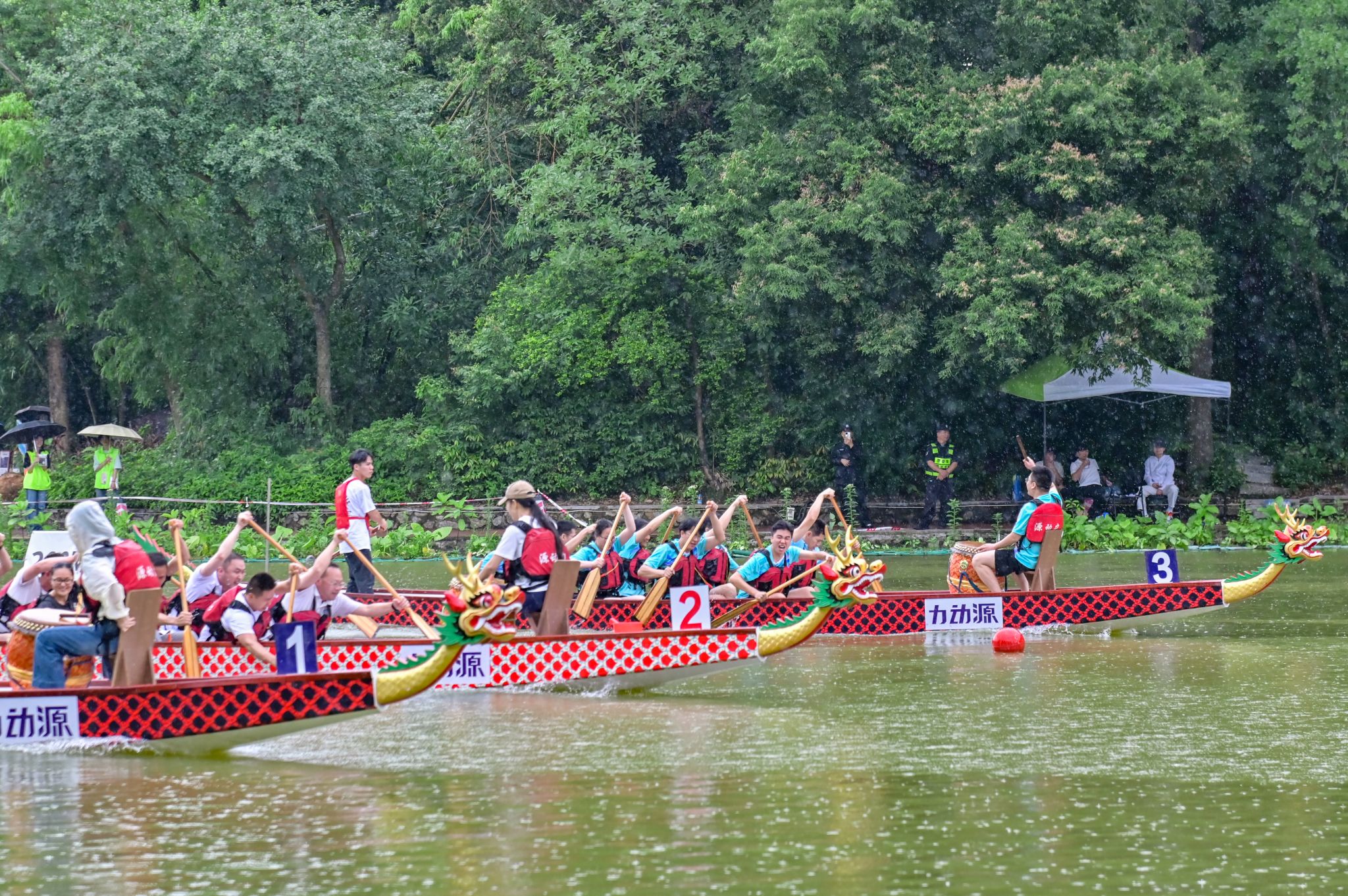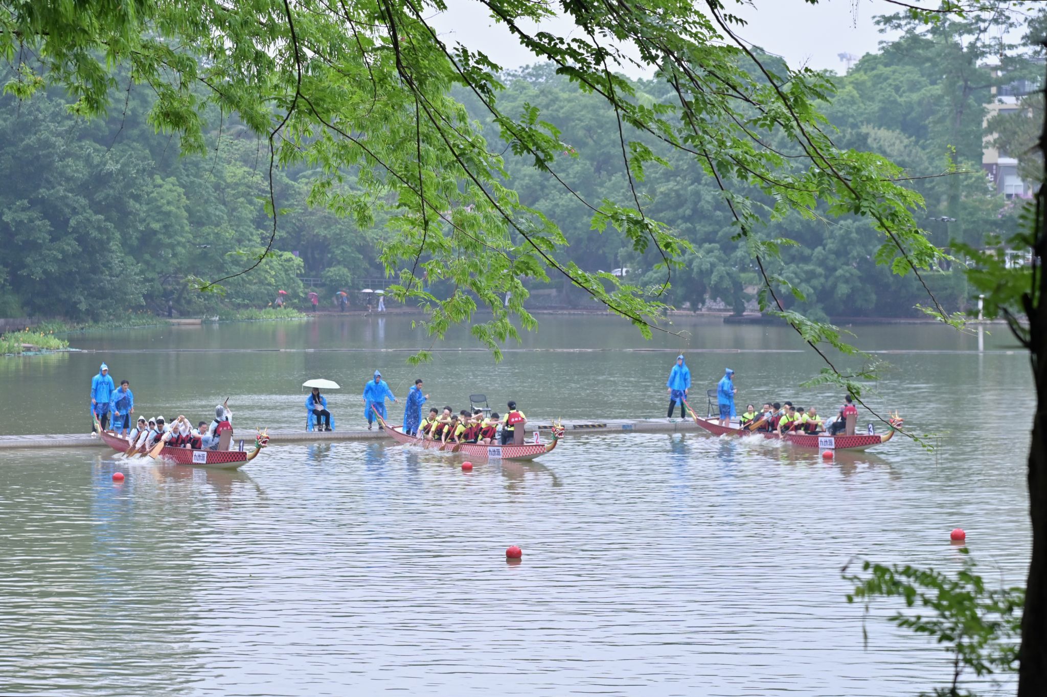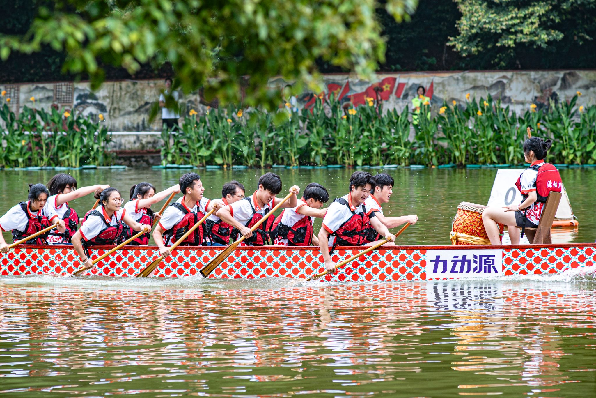上午9时许,伴随着震天鼓声,比赛正式开始。发号声响,河中龙舟犹如蛟龙出水,势如破竹,极速前进。鼓手奋力击鼓,桨手们齐喊口号、挥桨如飞,彼此配合默契,动作整齐划一,平静的湖面水花四溅,激起一阵阵波澜。现场热闹非凡,鼓声、呐喊声、加油声、口号声此起彼伏,奏响拼搏奋斗的激昂乐章。