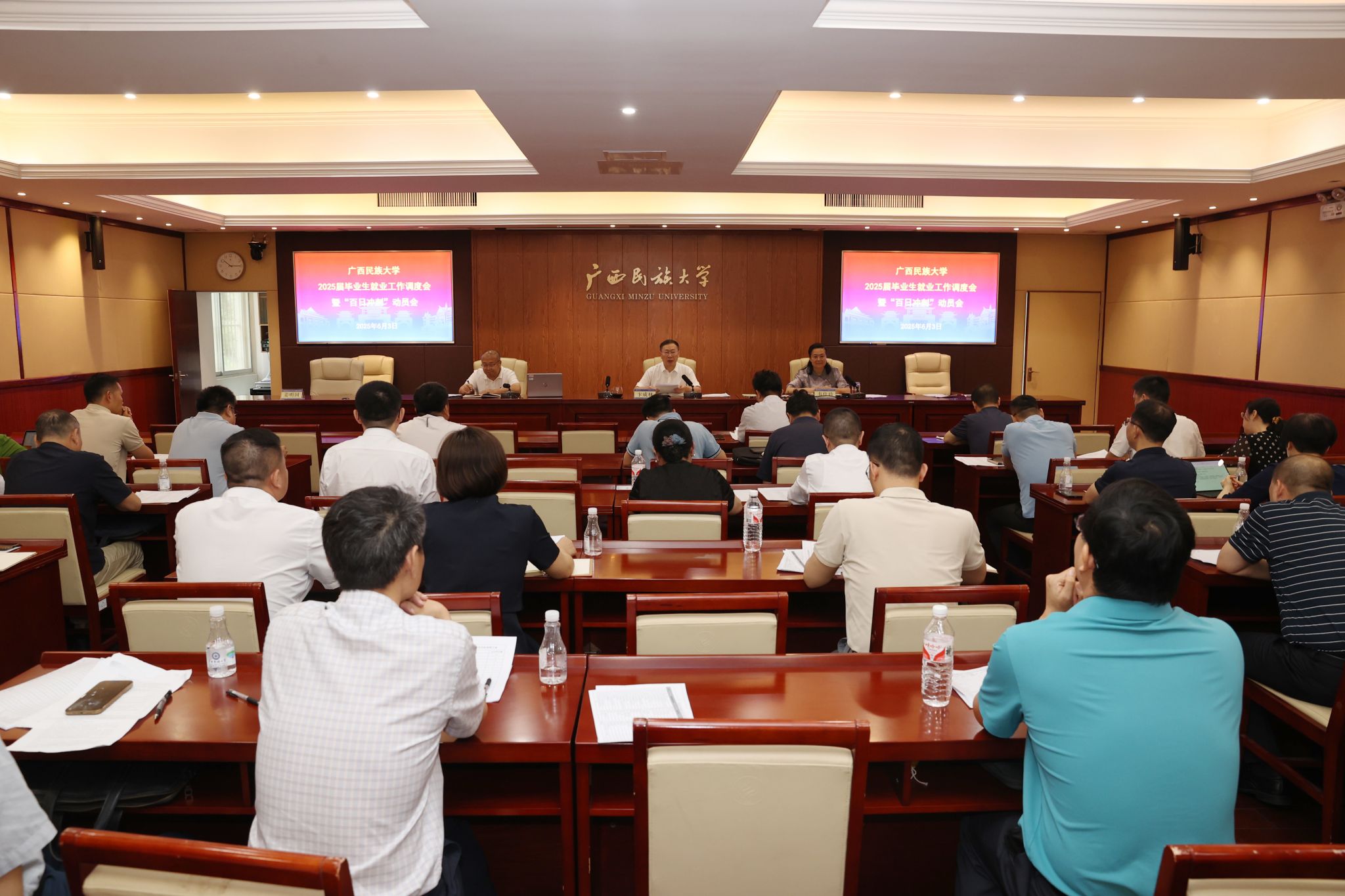【大学生通讯社报道】6月3日上午,澳门网投官方网站在办公楼212会议室召开2025届毕业生就业工作调度会暨“百日冲刺”动员会。校党委书记卞成林,校长韦仕珍,副校长姜明国出席会议,学校有关职能部门及学院负责人参加会议。