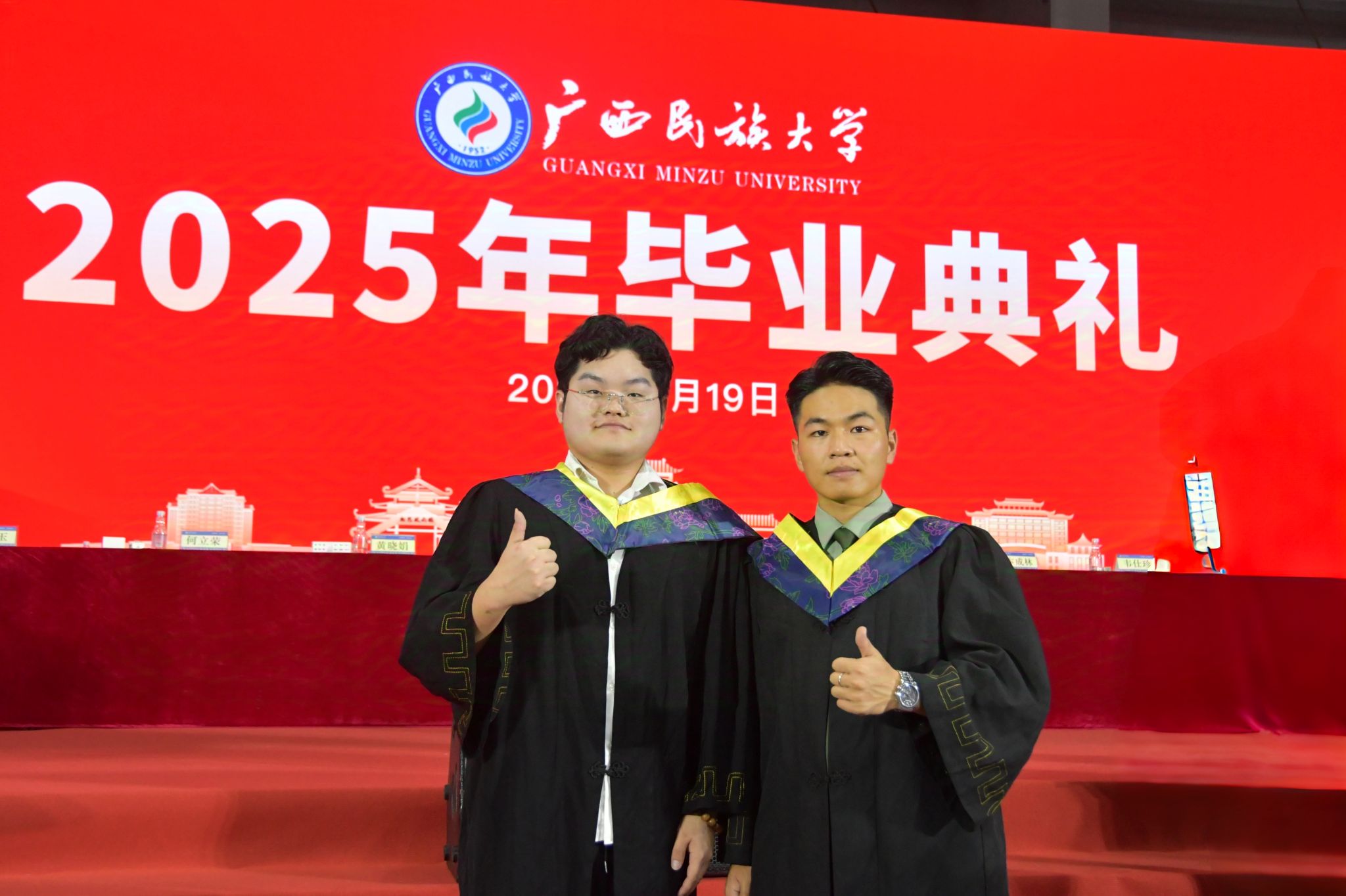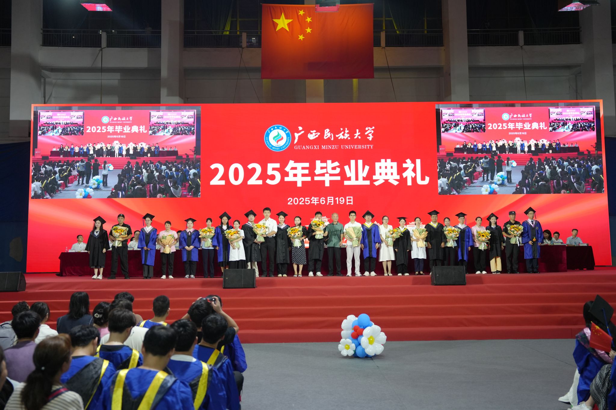卞成林、韦仕珍分别为获得自治区优秀毕业生称号与校长奖学金的毕业生颁发荣誉证书。校党委副书记陈铭彬宣读入选大学生志愿服务“西部计划”志愿者、选调生等毕业生名单以及应征入伍名单。