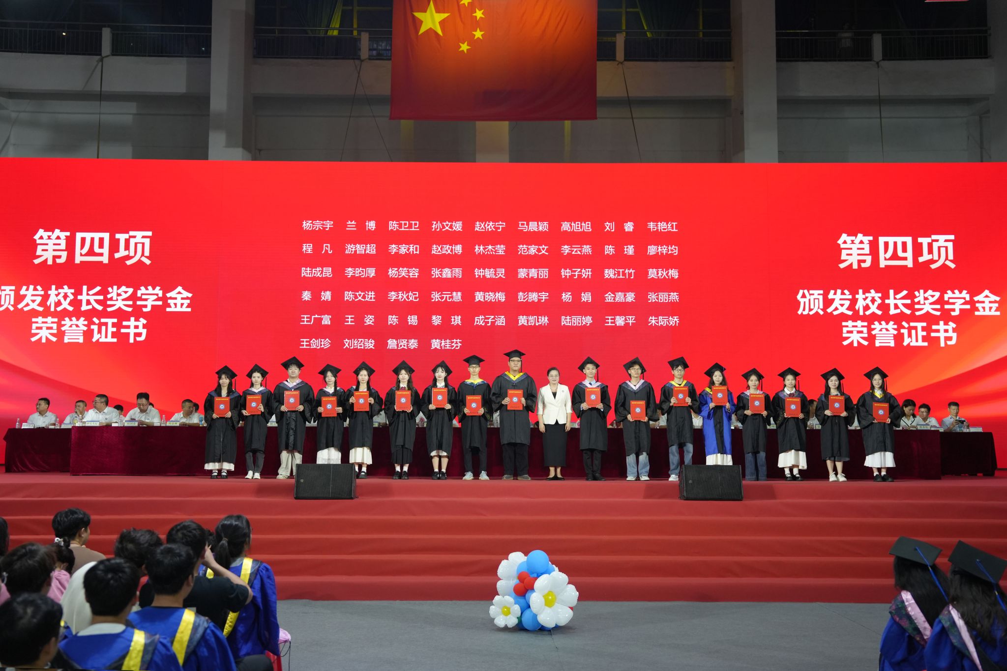 全体校领导为毕业生代表发放毕业证书并赠送毕业纪念品