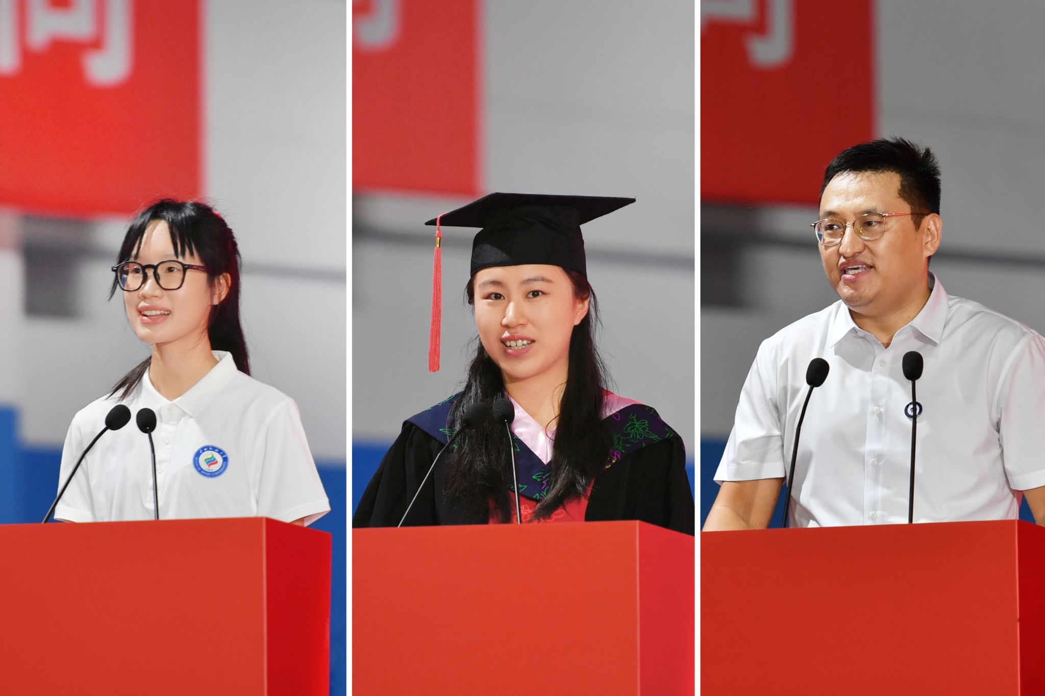 在校生代表、东南亚语言文化学院2022级本科生卢海阳(左一),毕业生代表、民族学与社会学学院2022级民族学专业博士生孙妍琰(中),教师代表、经济学院高斌教授(右一)先后发言