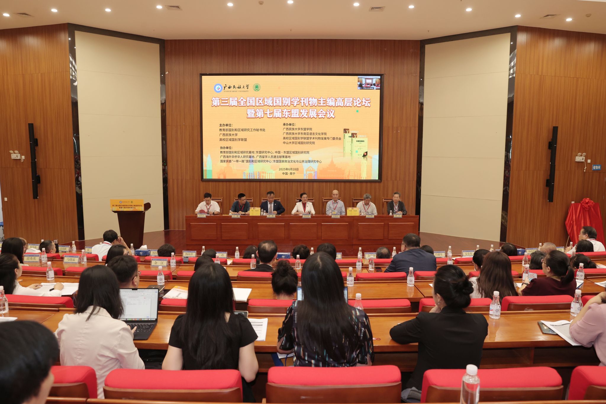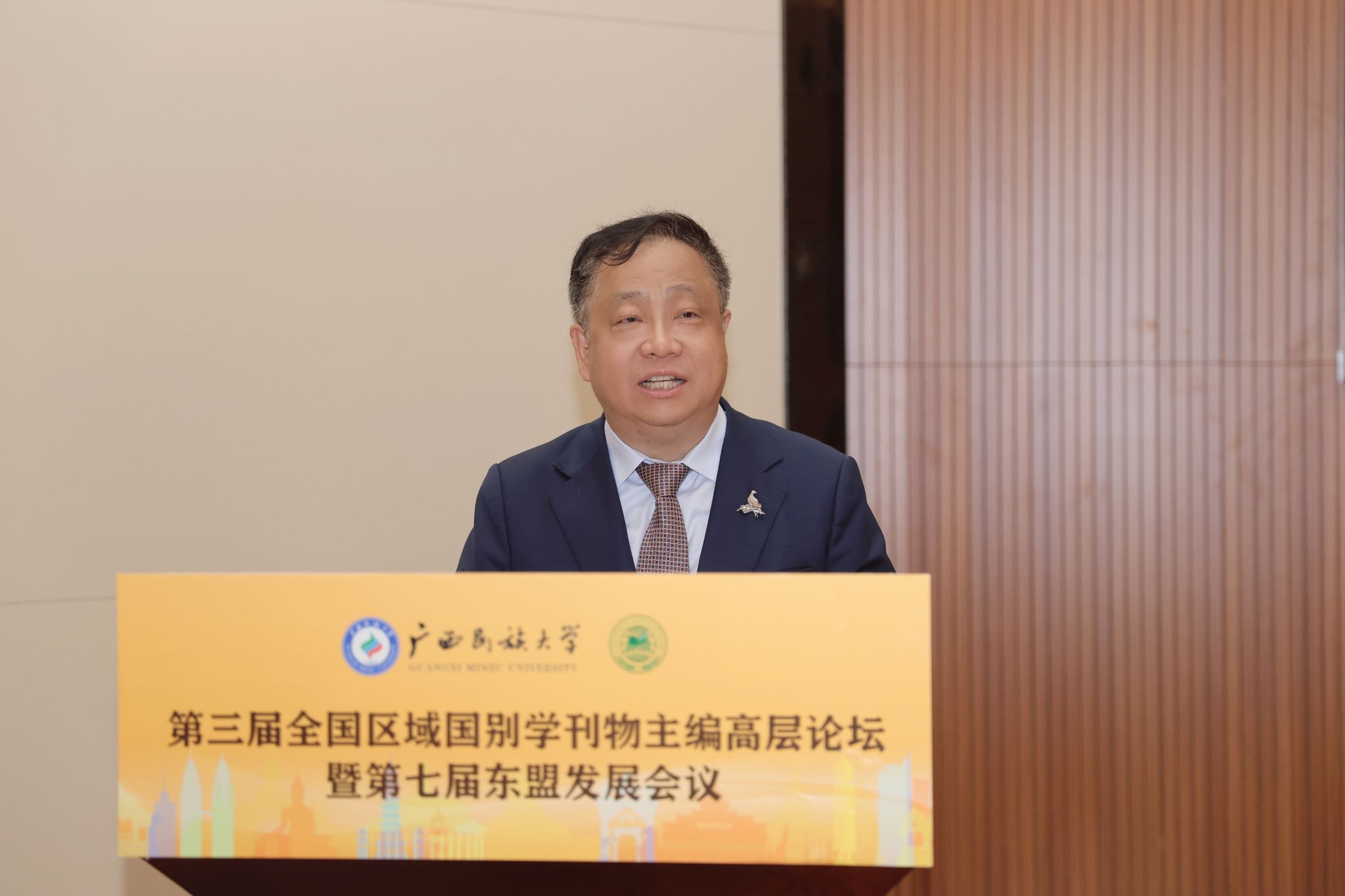 【大学生通讯社报道】6月28日,第三届全国区域国别学刊物主编高层论坛暨第七届东盟发展会议在澳门网投官方网站思源湖校区图书馆报告厅举行。澳门网投官方网站校长韦仕珍,教育部国别和区域研究工作秘书处主任、高校区域国别学联盟学术委员会主席罗林出席会议并致辞。高校区域国别学联盟秘书长、中山大学区域国别研究院院长陈杰,天津商业大学副校长余江,上海社会科学院《史林》主编、历史研究所所长郭长刚,上海社会科学院《国际关系研究》主编、国际问题研究所所长王健,《南洋问题研究》主编、厦门大学国际关系学院/南洋问题研究院教授、澳门网投官方网站“八桂学者”庄国土以及国内高等院校和科研机构专家学者参加会议。澳门网投官方网站副校长高兴宇主持开幕式。