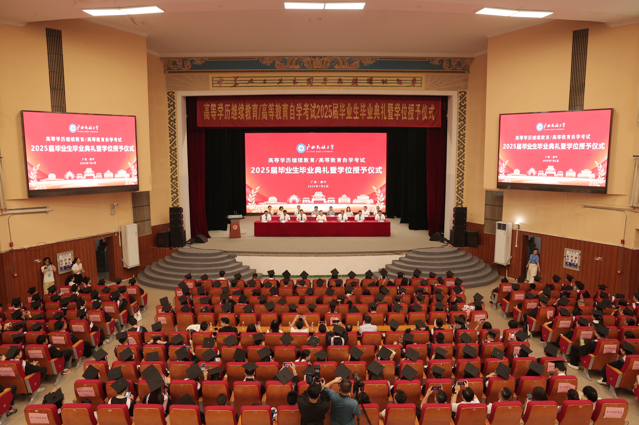 【大学生通讯社报道】7月6日上午,澳门网投官方网站在相思湖校区礼堂举行高等学历继续教育/高等教育自学考试2025届毕业生毕业典礼暨学位授予仪式。校长韦仕珍出席典礼并致辞。学校部分学位评定委员会委员,教师代表,各校外教学点、各自考合作院校负责人及工作人员, 2025届近700名毕业生参加毕业典礼暨学位授予仪式。典礼由副校长蔡高根主持。